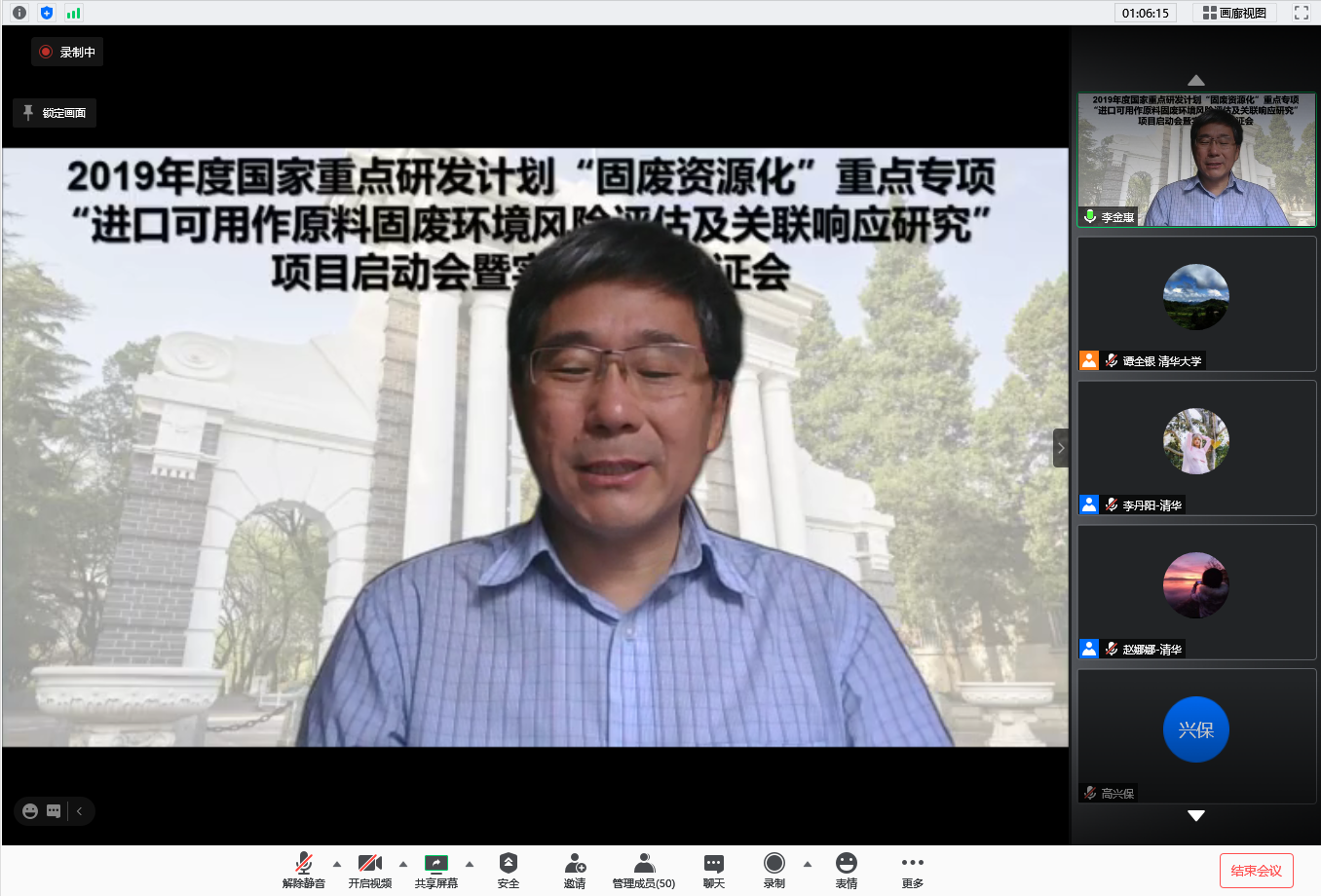 MK官网2020年8月24日电 (通讯员 李丹阳)8月21日,由清华大学牵头、环境学院李金惠教授作为项目负责人承担的2019年度国家重点研发计划“固废资源化”重点专项“进口可用作原料固废环境风险评估及关联响应研究”项目启动会暨实施方案论证会以在线会议形式成功召开。会议邀请了中国工程院院士、中国环境科学研究院研究员段宁等8位专家担任项目实施方案论证专家组成员。参加会议的还有生态环境部固体废物与化学品司固体处高兴保副调研员,清华大学科研院高级项目主管曹立鹏,环境学院副院长蒋靖坤教授,中国21世纪议程管理中心项目专员王猛,以及项目负责人、课题负责人等项目骨干共计50余人。启动会由项目负责人李金惠教授主持,项目实施方案论证会由段宁院士担任专家组组长并主持。