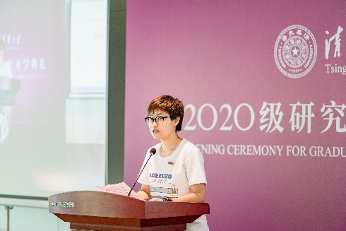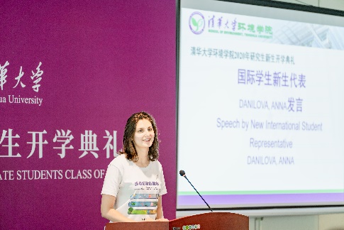 2020级研究生新生代表陈悦结合本科四年的经历讲述了自己对清华、对研究生阶段工作的认知与理解,表达了身为环境人“热爱我环境,光大我事业”的决心。来自俄罗斯的安娜(Danilova Anna)作为2020级国际学生代表,讲述了自己对气候变化、世界环境问题的思考,表示一定会珍惜在清华学习的机会,为全球环境保护事业做出贡献。