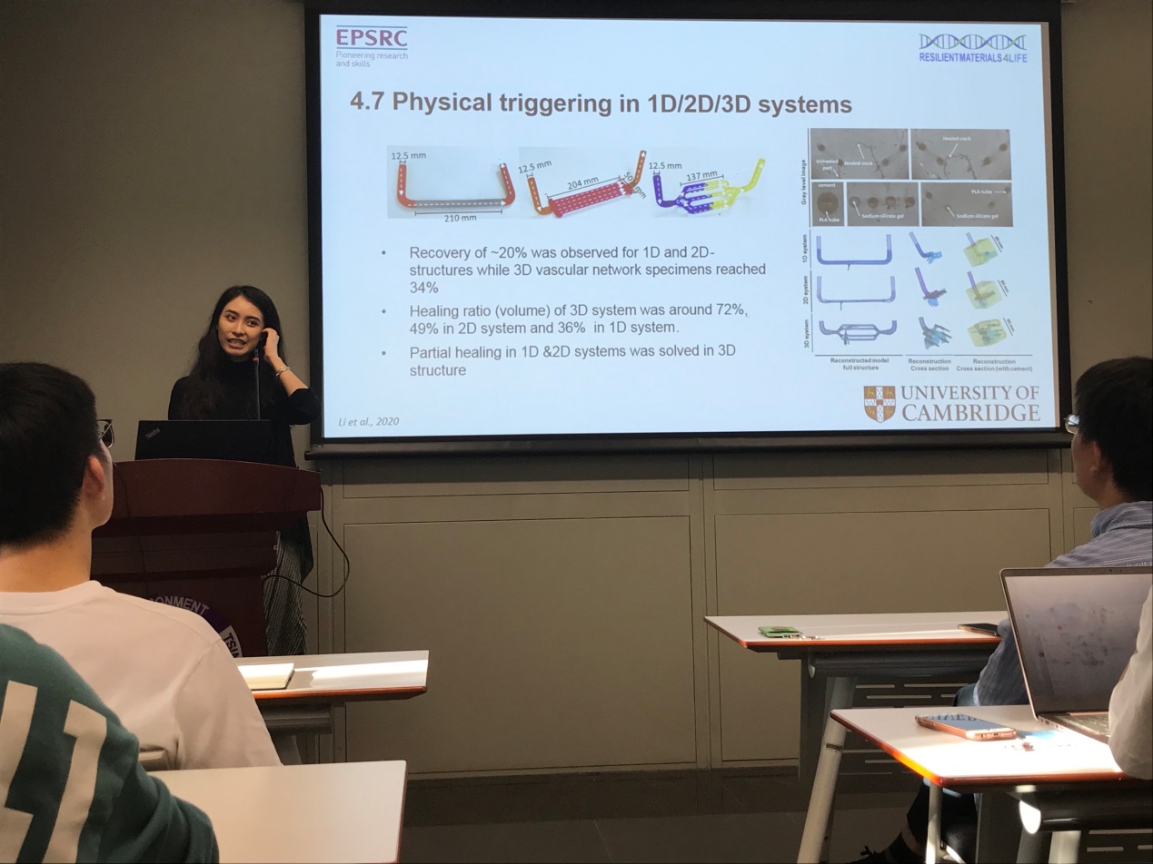 李紫晶博士首先介绍了基础设施在复杂老化因素影响作用下产生的灾害,并且这种风险在城市工业化进程中日益凸显,阐述了自修复材料在基础设施及环境领域所面临的机遇与挑战。随后,李紫晶博士逐一介绍了目前应用较为广泛的自行愈合、自主愈合及形状记忆聚合等类别自修复材料的适用条件、功能特点和作用机理。从实际修复案例出发,并且结合她在剑桥大学的攻关课题,深入浅出地分享了基于胶囊自修复以及血管自修复的技术与应用。其中,胶囊自修复材料具有制备工艺简单、技术成熟、便于施工等特点,是当今自愈和材料研究领域的热点问题。而血管自修复材料则是创新性地将三维连通管路嵌入水泥机体中,通过改变注入愈合剂的组成与配比,灵活、高效地实现微裂隙的智能愈合。最后,李紫晶博士结合目前行业发展的趋势,展望了自修复材料的商业发展前景,并且对材料研发的目标与方向,及其在环境修复中的应用提出了构想。讲座结束后,在场师生踊跃提问,现场气氛热烈,与李紫晶博士就自修复材料的绿色、健康及可持续性进行了深入的沟通与交流。