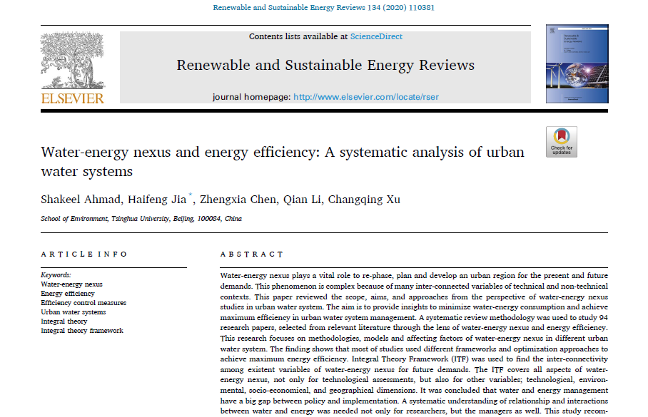 9月24日,MK官网贾海峰教授课题组在《Renewable and Sustainable Energy Reviews》(影响因子12.11)在线发表题为《城市水系统水-能耦合和能源效率系统分析》(Water-energy nexus and energy efficiency: A systematic analysis of urban water systems)的论文。