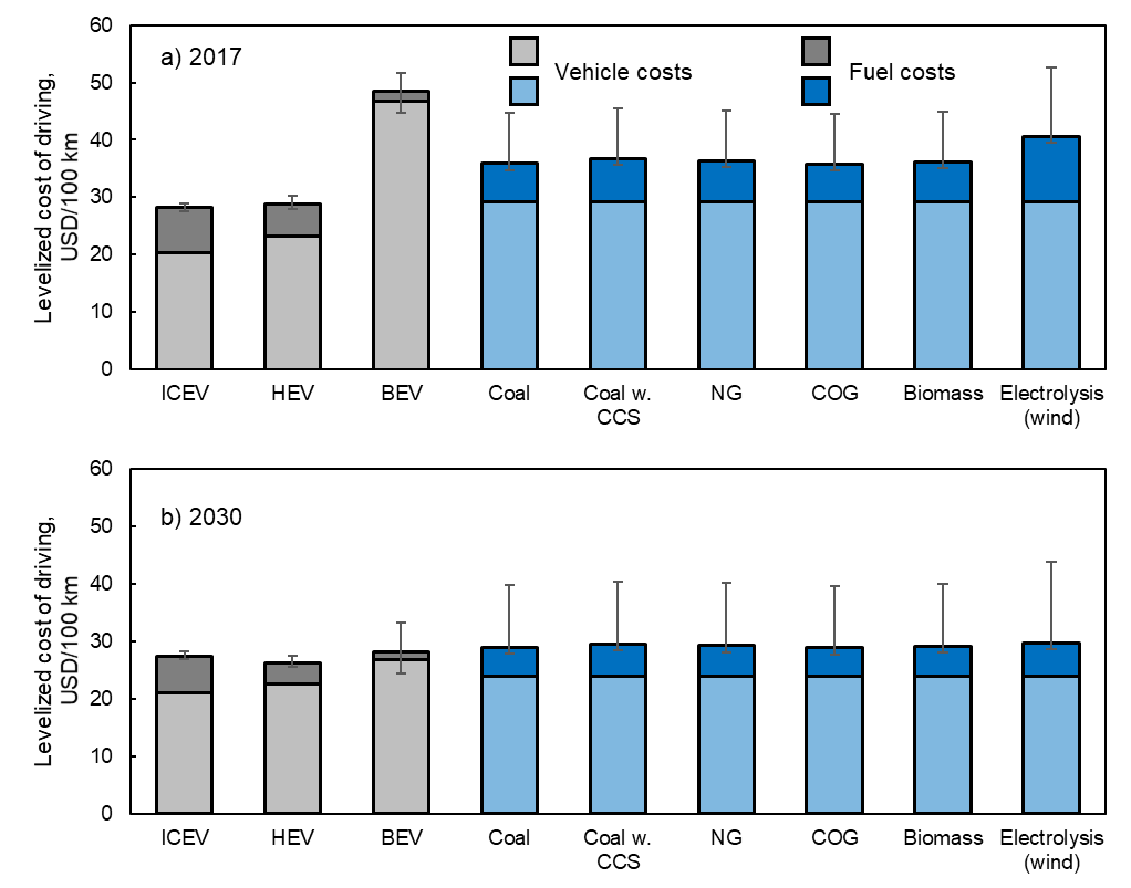 图2.2017和2030年中国氢燃料电池汽车、汽油内燃机汽车、混合动力汽车和纯电动汽车的平准化驾驶成本(levelizedcost of driving, LCD)