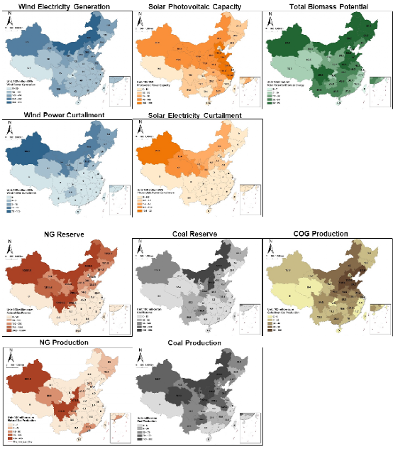 图3.中国可再生氢能资源(风能、太阳能、生物质)和传统氢能资源(天然气、煤、焦炉煤气)分省分布