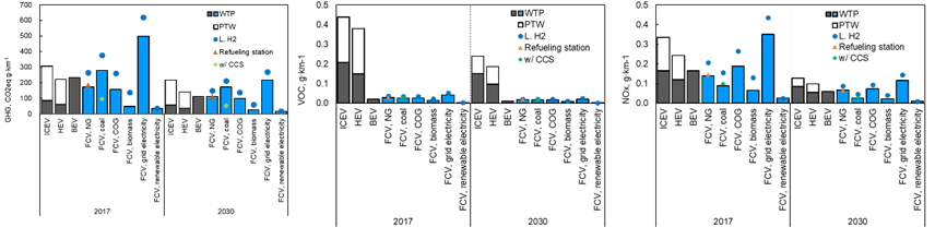 图1.2017和2030年中国氢燃料电池汽车、汽油内燃机汽车、混合动力汽车和纯电动汽车的燃料生命周期温室气体、VOC和NOx排放
