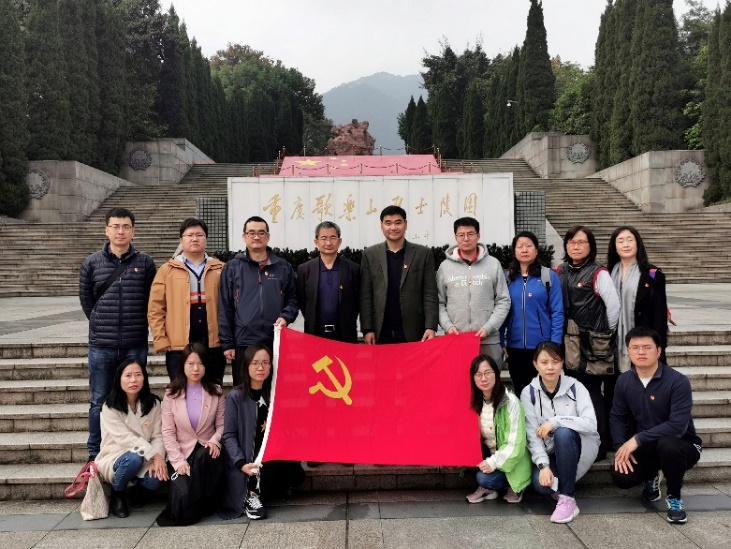 翌日,支部一行人前往重庆歌乐山烈士陵园和白公馆缅怀革命先烈,在歌乐山烈士陵园中,支部党员为革命先辈敬献花圈和花束。大家面对党旗,庄严肃穆地重温了入党誓词。支部党员认真瞻仰了烈士遗像,深入学习江竹筠(江姐)等先烈的伟大革命精神与革命意志。参观完关押、残害革命先烈的白公馆后,支部党员纷纷表示要学习革命先辈不怕牺牲、艰苦斗争的革命精神,立足自身科研岗位,为中国特色社会主义现代化建设征程多做贡献。
