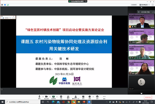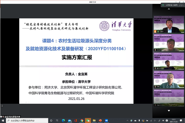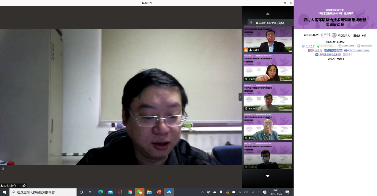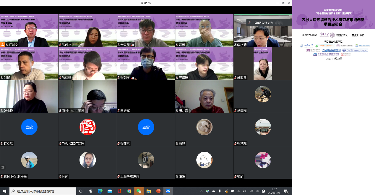 环境学院2021年1月26日电 2021年1月26日,由清华大学牵头的“十三五”国家重点研发计划“绿色宜居村镇技术创新”重点专项——“农村人居环境整治技术研究与集成创新”项目启动会顺利召开。本次会议采用线上方式举行,清华大学、同济大学、中国环境科学研究院、中国科学院生态环境研究中心各课题承担单位共计118余人参加了此次项目启动会。