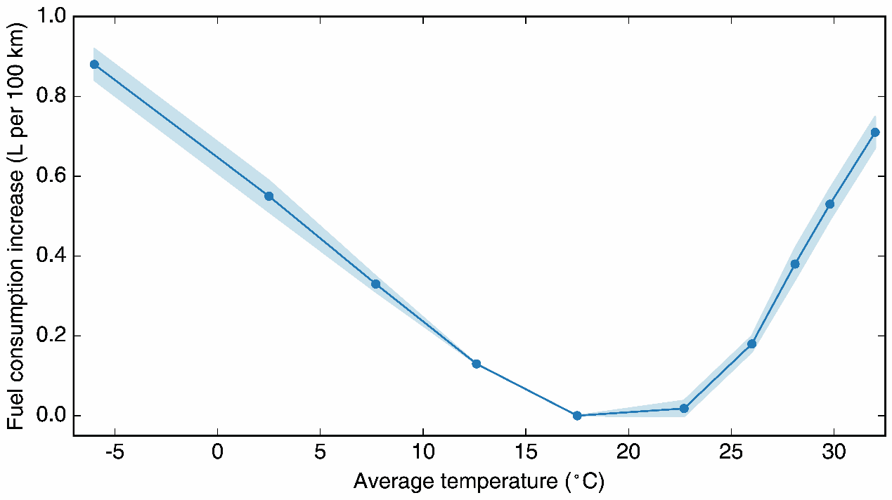 图 1 中国轻型乘用车燃油消耗随平均气温的变化(以15℃~20℃为基准)
