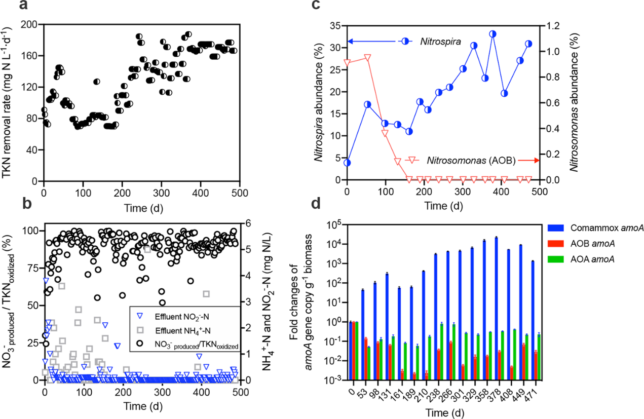 该联合团队将尿液废水作为膜生物反应器(MembraneBio-Reactor, MBR)的进水,成功在200天内实现了全程硝化菌的富集(相对丰度高达30%)。该反应器表现出了良好的硝化效果,进水中总凯氏氮全部被氧化为硝酸盐氮,出水中无亚硝酸盐积累(图1b),最高去除负荷达188 mg N·L−1d−1(图1a)。16SrRNA扩增子测序结果表明,该微生物群落中硝化螺菌属Nitrospira占主导地位,传统AOB Nitrosomonas则在反应器运行至第161天后逐渐被淘汰,而Nitrospira的相对丰度最高上升至高于30%(图1c)。qPCR对不同种类amoA基因的变化分析结果进一步证明了富集的Nitrospira大部分是携带amoA基因的Comammox Nitrospira,而并非传统的NOB,它们的amoA基因拷贝数增加了4个数量级,而AOB和AOA的amoA基因拷贝数始终处在较低水平(图1d)。这些结果共同证明了全程硝化菌Nitrospira在以尿液废水为进水的MBR反应器中得到了选择性富集,并逐步淘汰了AOA和AOB。