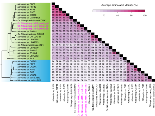 图2 富集的全程硝化菌Nitrospira的系统发育树分析以及同其他全程硝化菌Nitrospira的平均氨基酸指数比较