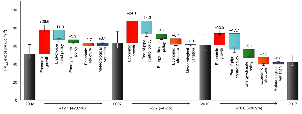 研究发现,2002–2017年间,我国PM2.5污染相关的过早死亡风险增长了23%。其中,经济快速增长导致的化石能源消费激增是致使死亡风险增加的主导因素之一,使得PM2.5相关死亡风险增加123万人;而污染末端治理政策的实施避免了87万人的死亡风险,抵消了经济增长导致死亡风险增量的70%左右。能源结构转型和经济结构优化对空气污染改善也有显著贡献,合计避免了72万人的过早死亡风险。2012–2017年间,随着《大气污染防治行动计划》(“大气十条”)的实施,污染末端治理和能源结构转型措施力度显著加强,推动中国PM2.5相关死亡风险出现下降拐点。