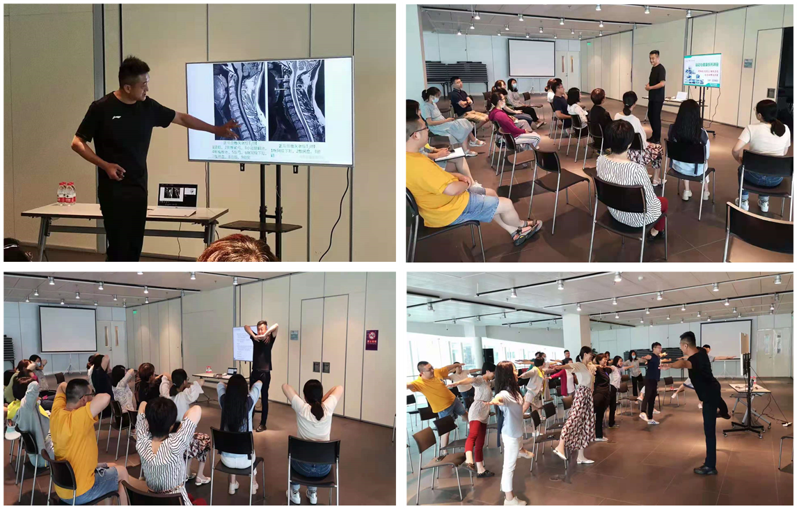 王彦教授将体育与医疗相结合,不仅熟悉人体肌肉、骨骼和结构,还精通运动康复方法。他认为,每个人都应该了解并熟悉自己的身体,然后通过科学的锻炼,让身体更加健康,进而提高工作效率和生活质量。他针对当前长期伏案工作带来的肩颈腰问题,讲解了问题产生的主要原因,并为大家教授了几个简单有效的动作,便于工作间歇时进行锻炼,缓解并改善由于久坐伏案带来的肩颈腰问题。活动现场互动热烈、气氛活跃。