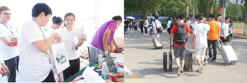 志愿者帮助新同学发放手提袋、搬运行李
