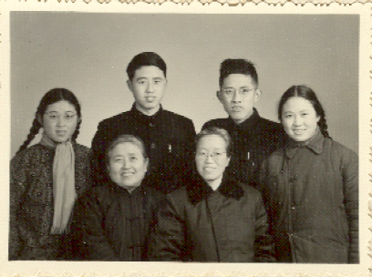 母亲张一贯、姨妈张一飞和钱易兄妹四人(6人均为教师,第一排左起:母亲张一贯、姨妈张一飞;第二排左起:钱易、大哥钱拙、二哥钱行、妹妹钱辉)