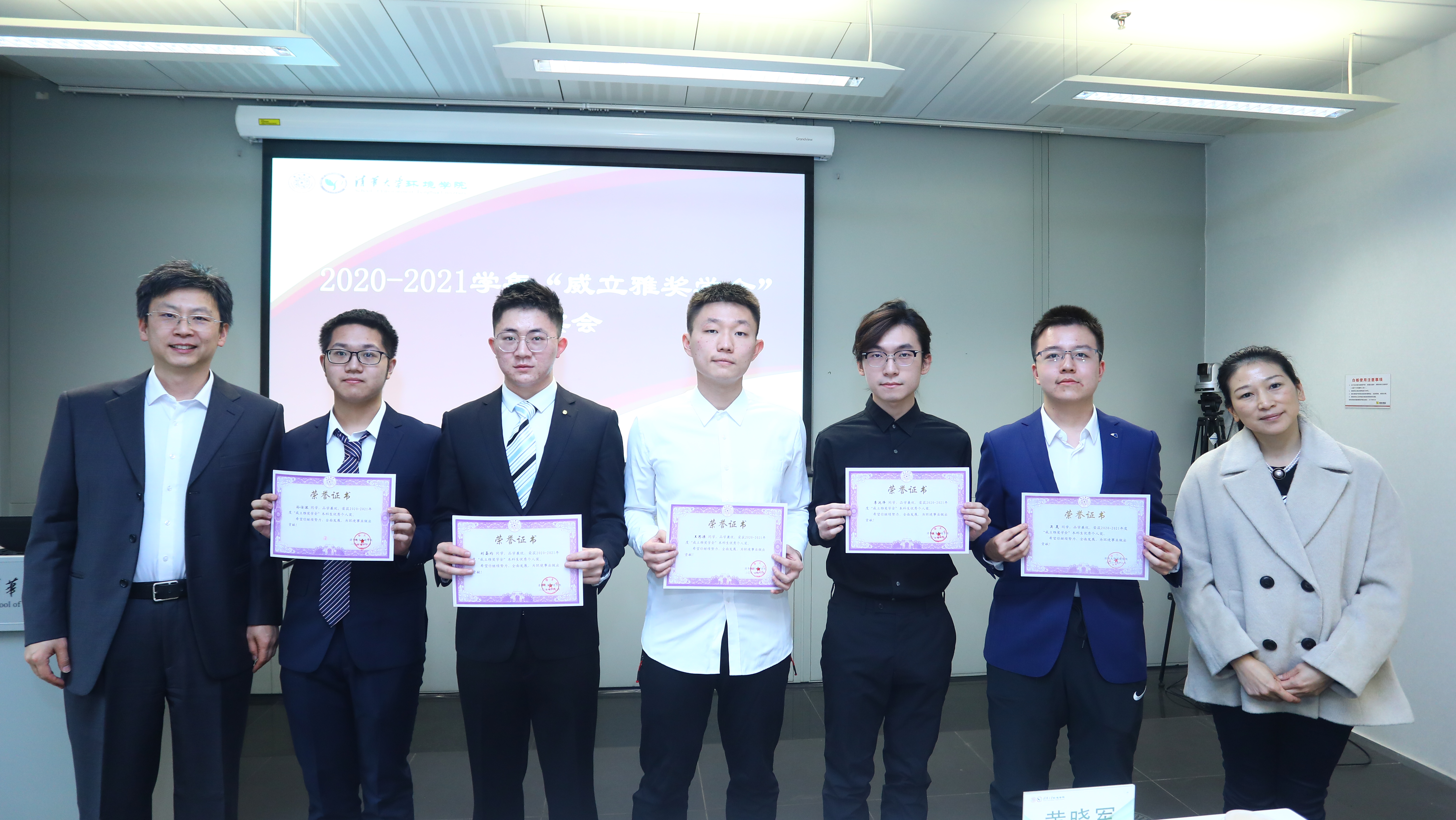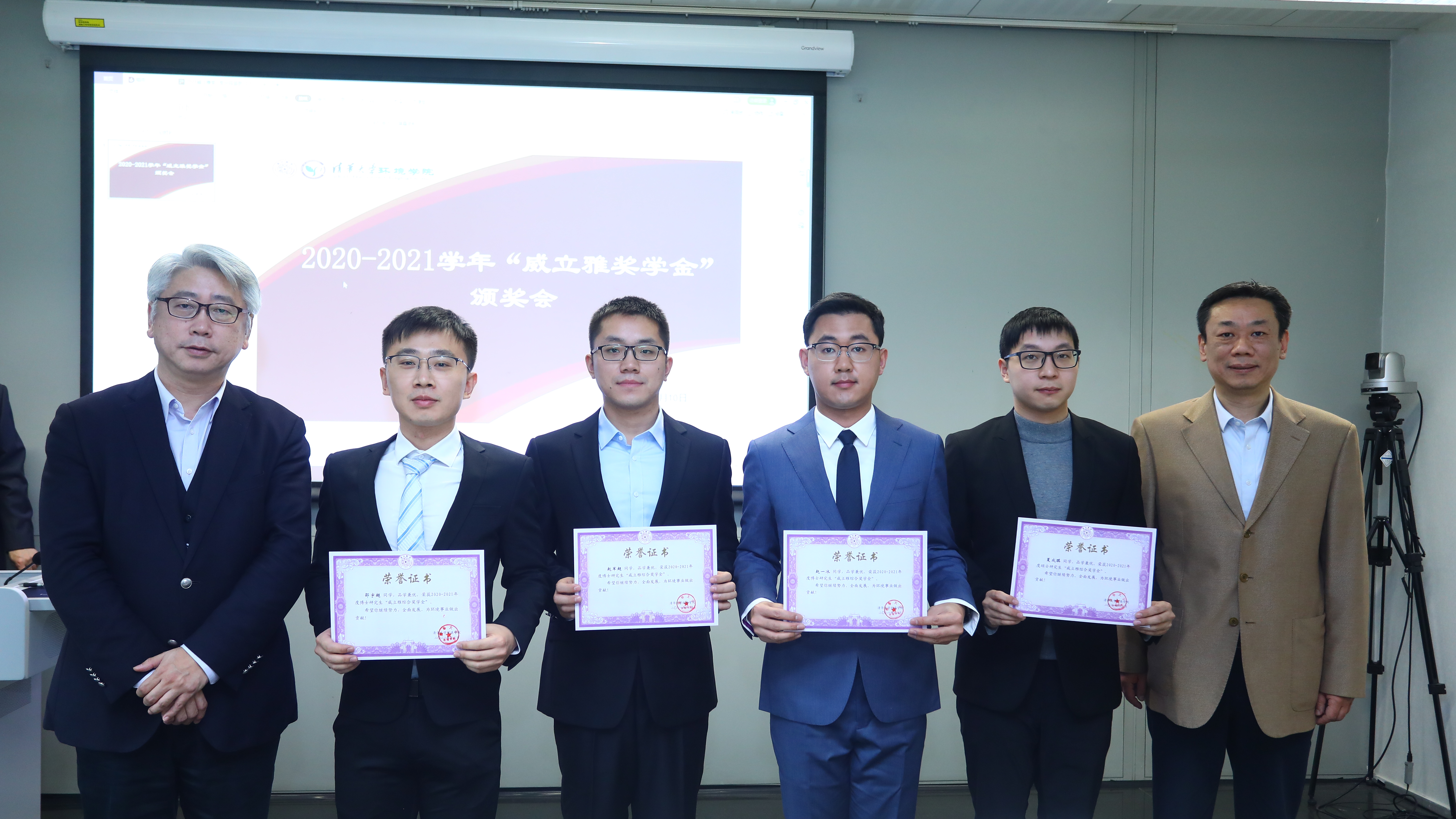 威立雅拔尖创新人才奖学金设立于2008年,由威立雅集团出资设立,迄今已评选13届。2021年,共有34名本科生与研究生获得“威立雅”奖学金,其中综合优秀奖15人、优秀个人奖19人。随后,刘毅与黄晓军、席劲瑛与蒋影华分别为获得综合优秀奖和优秀个人奖的同学颁奖并合影留念。