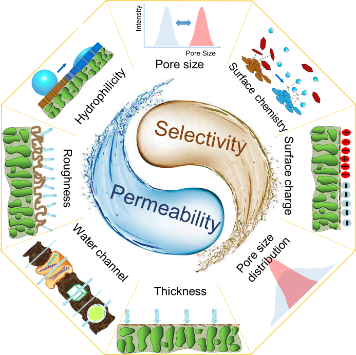 本研究基于溶剂/溶质传质理论和数学模型,系统讨论了纳滤膜的特征-性能关系,分析纳滤膜结构和表面化学参数对分离性能的影响,并指出通过减小分离层的厚度、增大水有效渗透面积、构造水快速渗透通道和提高分离层亲水性来改善纳滤膜的水渗透性能;通过调控膜孔大小及分布、膜表面电荷和亲疏水性来提升纳滤膜的选择性。在此基础上,总结了近年来研究人员在不同调控策略方面做出的努力,通过对数据的定量化统计分析揭示不同调控策略的内在机理并指出不同方法待深入研究的问题。
