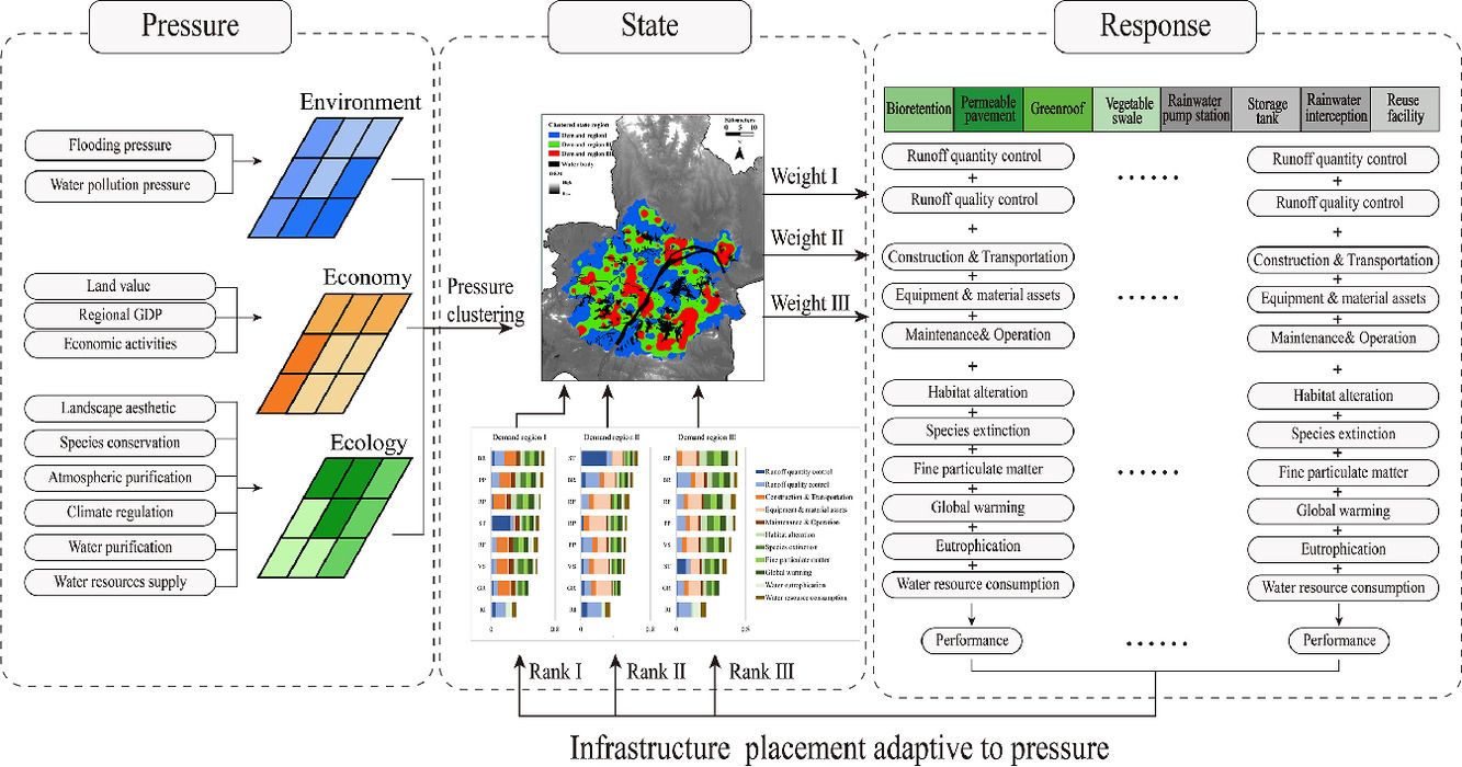 在应对洪水、资源枯竭和生态退化等威胁时,需要平衡生态环境安全、城市发展和区域的自然禀赋。绿色和灰色径流控制基础设施的效益在应用过程中从环境角度扩展到经济和生态角度,并且基础设施的适应性具有高度的本地化特征。因此,区域面临的环境、经济、生态多方面压力具有高度协同性和复杂性,仅通过管理者的主观偏好来识别区域压力的优先缓解策略可能与实际情况相违背。针对性的径流控制基础设施空间布置决策能够有效缓解区域面临的多方面压力。基于此,研究团队首先量化识别了区域在环境、经济、生态方面压力的空间异质性,然后研究了多压力协同作用区域并分析不同区域中的压力缓解权重,最后依据权重制定不同区域的径流控制基础设施差异化比选方案,由此实现了径流控制基础设施的适应性空间布置决策。
