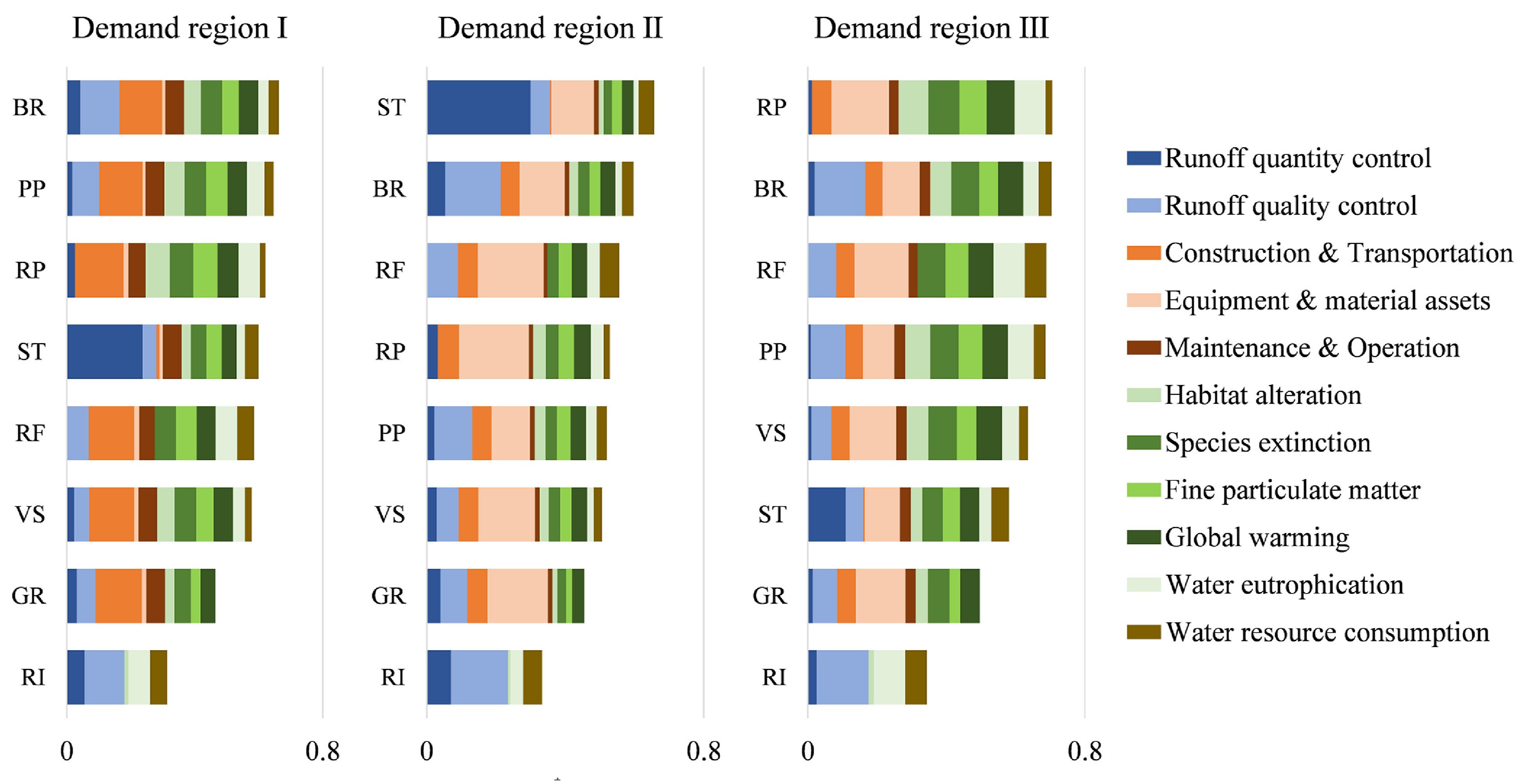 研究团队结合每个压力调整需求区域内的环境、经济、生态多目标权重,对径流控制基础设施的多功能效益进行加权评估,在不同区域内实现了差异化的基础设施性能等级排序,从而实现了空间规划和有针对性的基础设施分区布置建议。绿色基础设施在区域I中排名第一,因为在此区域中生态和环境压力的同时缓解具备高优先级。灰色基础设施在区域II和区域III中排名第一,在这些地区中生态或环境压力的缓解是高度优先的。