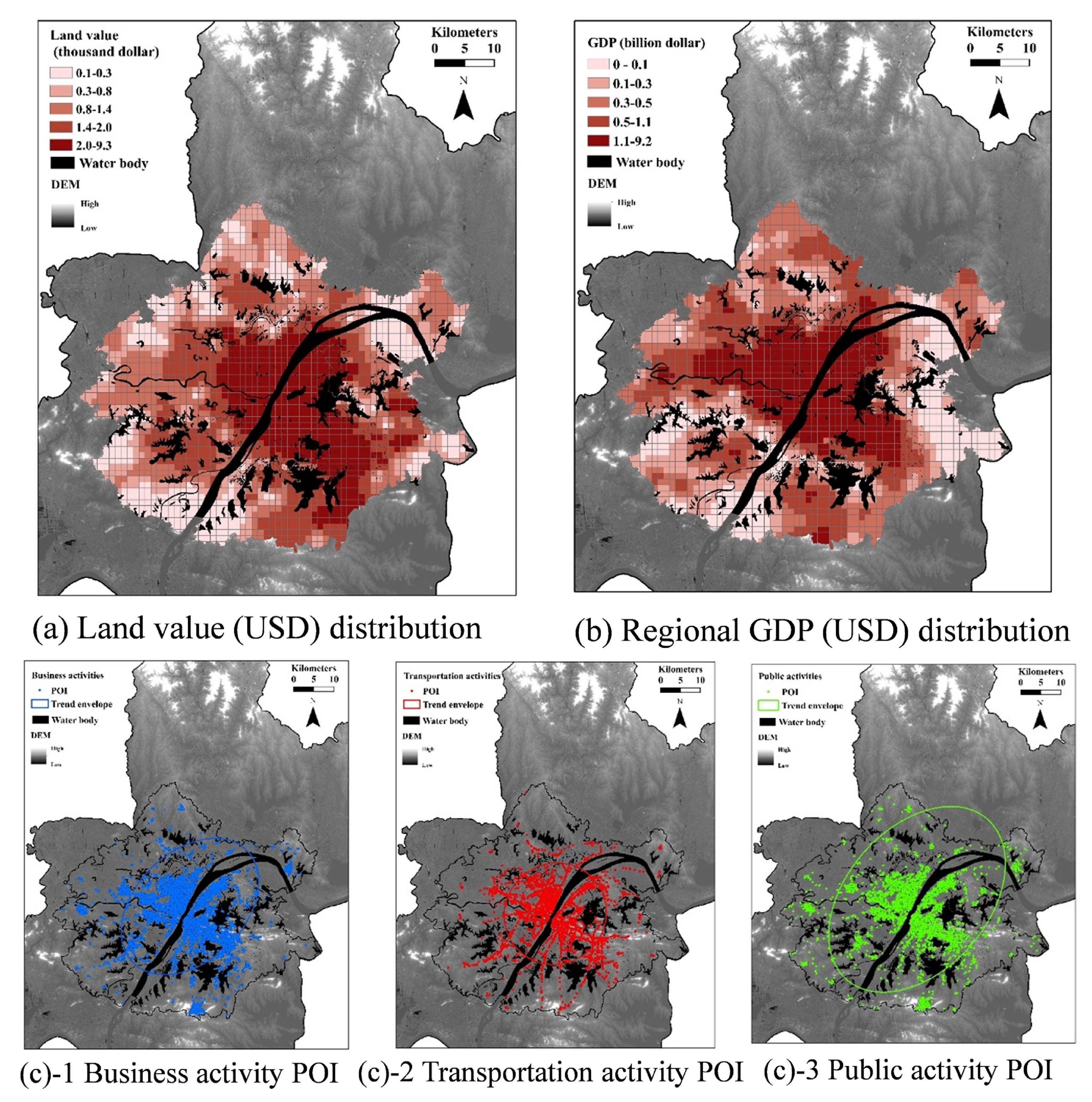 在经济因素方面,土地占用的机会成本、地方财政支持和经济活动动态的空间分布不均,限制了对基础设施生命周期阶段的投资。土地价值、GDP及人居经济活动密度的高值均分布在长江两侧的城市中心区域。这表明高度城市化的地区具备更高的经济敏感性。对区域多角度经济压力的量化能够从全生命周期角度判断径流控制基础设施的成本适宜性区域。