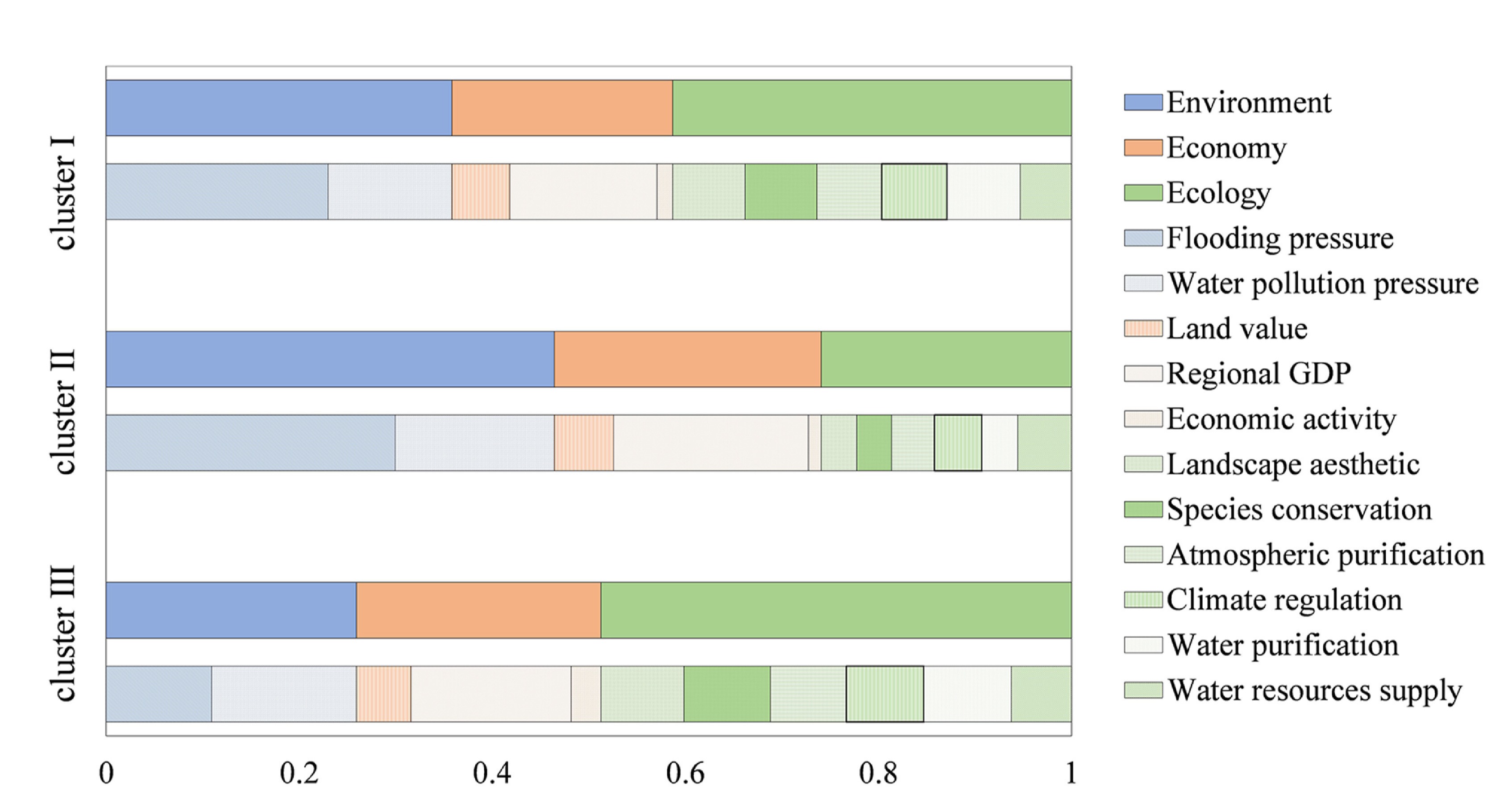区域多角度压力协同作用状态可通过压力聚类来识别,每个需求区域内对环境、经济、生态压力的调控优先等级有所差别。区域状态的分布呈现出显著的空间异质性。压力的量化提供了多方面调控需求比较的可能性。每个区域对应一种环境、经济、生态压力权重的组合情况,从而有针对性地提出径流控制基础设施的建议方案。