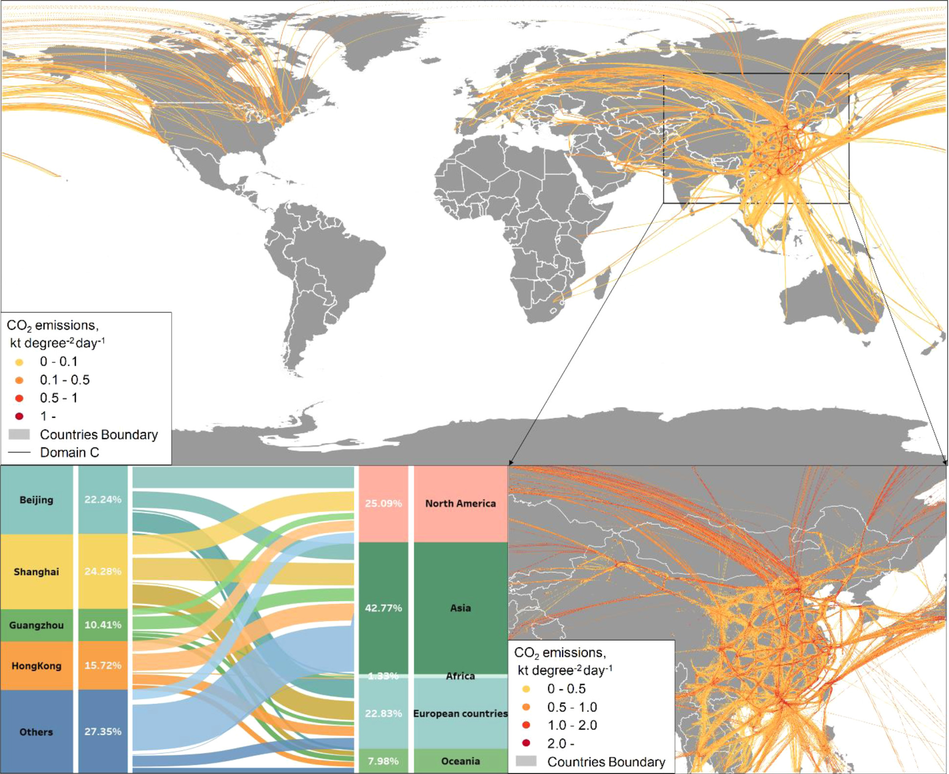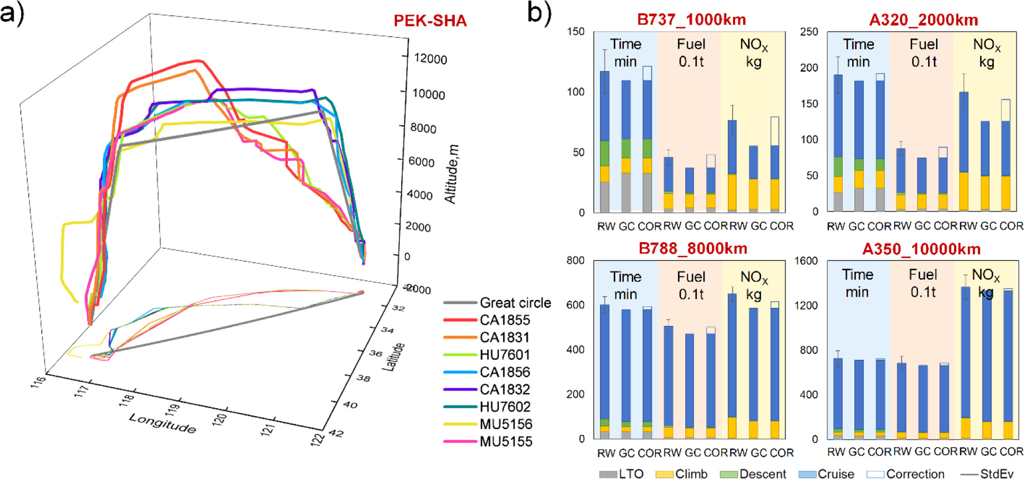 在全球化经济增长的背景下,航空运输需求激增。2000年以来,中国的民用航空客运量增长了12倍,增速位列世界主要经济体前列,预计很快将成为世界最大的航空市场。为了解中国航空排放的环境影响,团队研究开发了基于真实飞行轨迹的航空排放模型,构建了覆盖全飞行阶段的高时空分辨率中国航空业CO2和多污染物排放清单。