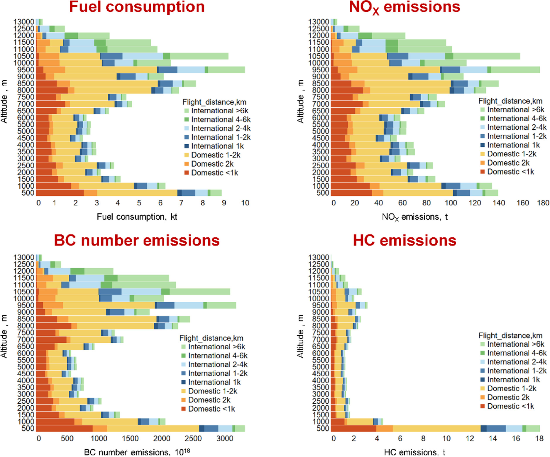 图4 中国航空的燃油消耗和污染物排放的垂直分布