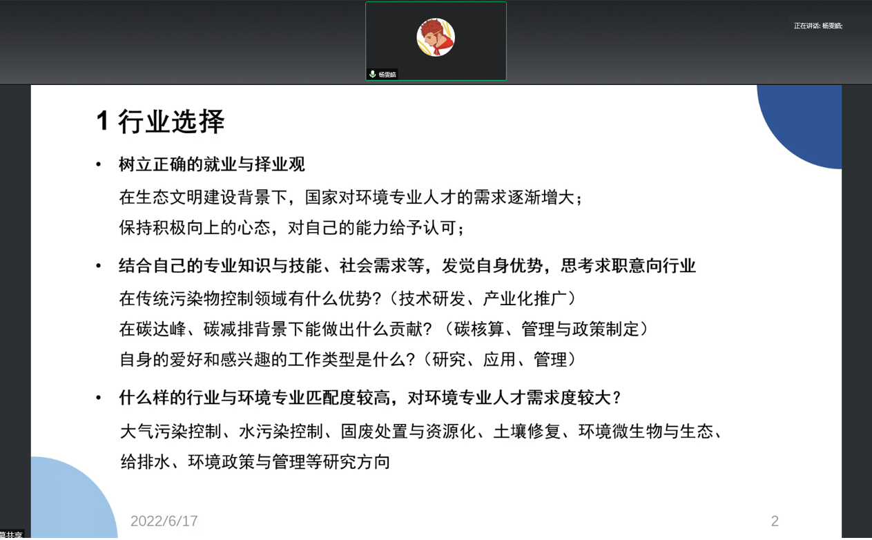 从两位师兄关于高校国企的分享中,我认识到求职要早做准备、提前规划,主动关注招聘信息,及时跟进。除此以外,也要明确自身优势,充分思考自己的职业兴趣,在做职业选择时拓宽视野,不局限于自己的小领域。关晓壮老师的分享提升了我对职场的认识,在工作中要“忘记自己是清华人,牢记自己是清华人”,忘记清华光环,脚踏实地开启新征程;牢记清华人的使命担当,为国奉献敢为人先。刘书明老师带领我们回顾了学院的历史,感受到历代环境人的赤诚奉献。环境专业的就业与国家的需求紧密联系,新时代新机遇下的环境人应永葆本色,有所作为。