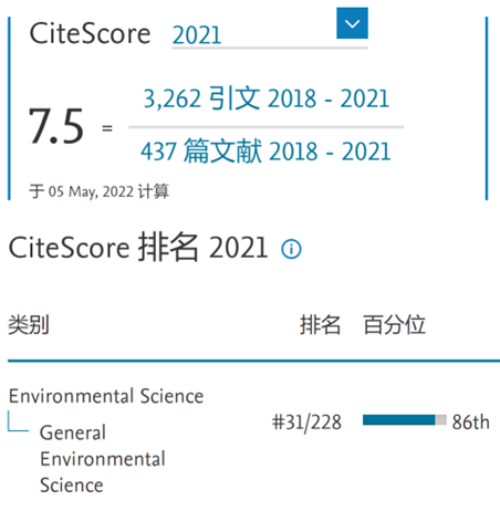 另据爱思唯尔(Elsevier)最新发布的 CiteScore™ 2021年度(引用分)指标,FESE的最新引用分为7.5,位列全球228种环境综合类期刊第31位。FESE的影响因子和引用分均得到持续稳步增长。