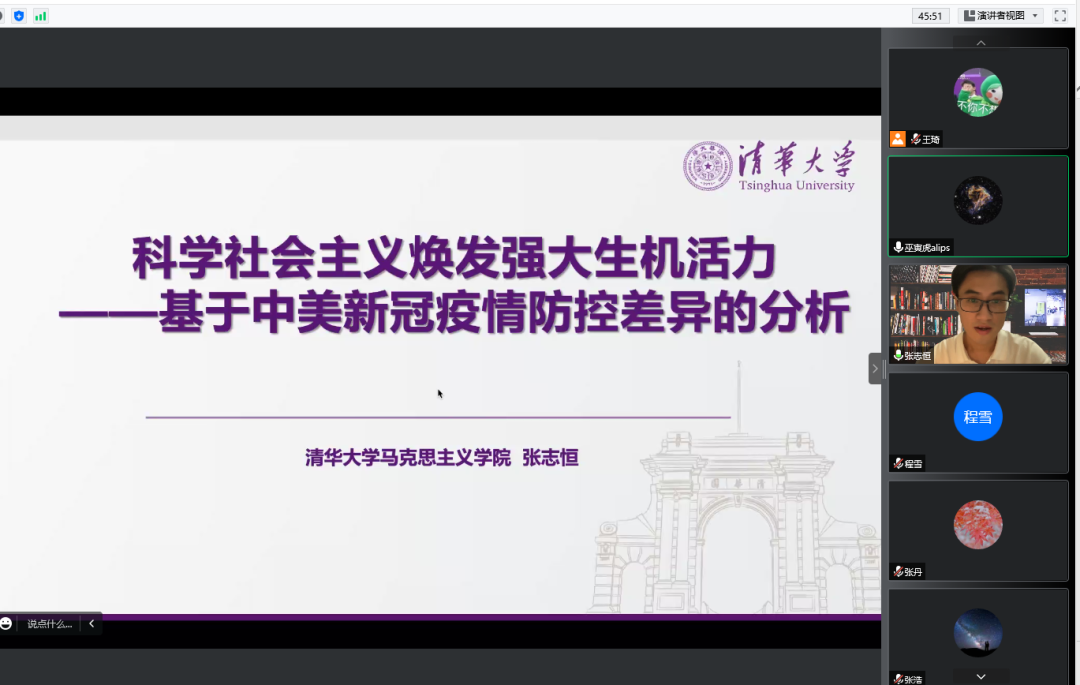 活动邀请清华大学马克思主义学院博士生讲师团张志恒讲师作了题为“科学社会主义焕发强大生机活力——基于中美新冠疫情防控差异的分析”的疫情防控专题报告。他从中美新冠疫情期间的现实表现、习近平新时代中国特色社会主义思想的历史方位、中国共产党的追求三个角度展开,比较了中美两国在应对新冠肺炎疫情中的现实表现,并分析了这种差异表现背后的原因。报告以清晰的逻辑、扎实的理论、翔实的案例,让与会师生对于中国共产党的政策选择和执政理念有了更深刻的理解,也更加明确了作为党员所担负的历史使命。