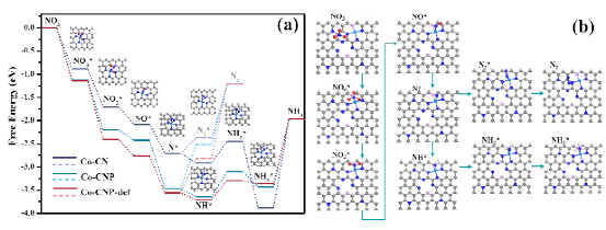研究团队根据密度泛函理论计算,创新强化污染物净化的单原子尺度结构调控理论与方法,从分子水平上对硝酸根在模型单原子钴催化剂活性位点的转化反应机理进行了探究,分析反应路径和能量变化。结果表明,硝酸根在单原子位点上逐步发生脱氧加氢的基元反应,N*物种可以在外部提供能量时进一步偶联形成氮气,也可以自发与氢逐步反应形成铵盐。磷掺杂后形成的缺陷位点可以促进临近CoP1N3位点对硝酸盐的催化转化,硝酸盐还原过程发生8电子数转移生成铵盐。此外,研究还发现,金属活性位点临近的缺陷结构有助于进一步提高单原子催化剂活性,在理论上为设计高活性位点的催化剂提供指导并揭示硝酸反应转化和产物分布规律。