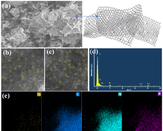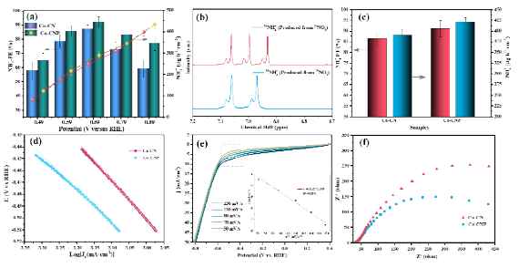 研究团队采用自然界极少的15NO3−作为氮源,以同位素标记法进一步证明了氨生成的唯一氮来源为硝酸盐。利用1H核磁共振(NMR)仪对产生的氨进行检测,14NH4+和15NH4+的核磁谱图分别具有典型的三峰和双峰结构。研究采用多种实验分析手段对载体结构进行了分析。结果表明,磷的掺杂进一步提高了碳氮载体的缺陷程度,提供了更多的固定位点负载单原子钴,并且缺陷位点会对相邻金属钴活性位点的电子结构和性能产生影响,提高了电极导电性。