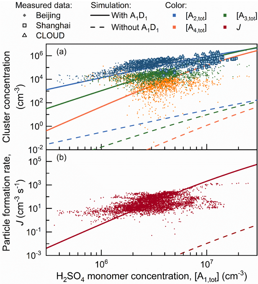 然而,所测得的酸碱团簇中碱性分子数量均小于硫酸分子数量,且碱性分子最早出现于含两个硫酸的团簇中。故曾有理论认为,气态硫酸转化为新粒子需首先生成硫酸双分子团簇,而碱性分子与硫酸双分子团簇的结合是决定新粒子生成速率的关键步骤。