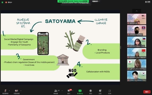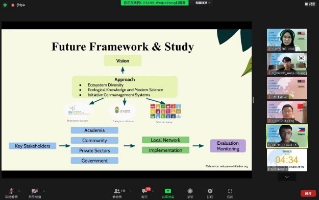 在为期三天的线上活动中,来自永旺财团(AEON Foundation)、早稻田大学等研究机构的专家学者对构建“里山”社区、景观和产品等课题进行了讲演,报告内容涉及“里山”理念的起源及其在日本的实践案例、现代生活中保留社会生态景观的方法探讨与展示、朱鹮保护和佐渡岛生态实验案例等。在学生讨论环节,各国学生围绕不同国家和不同民族的“里山”文化、保护“里山”所必须的现实条件和社会支持等问题展开了热烈讨论和交流。8月4日下午,各组学生对于“里山的未来继承”这一主题进行了最终报告展示。同学们就“里山”这一人与自然和谐共生的理念如何进行继承和现代化、科技化的改进,如何从“里山”理念出发,应对气候变化、环境污染等现实问题,从不同专业的视角提出了多种多样的方案。