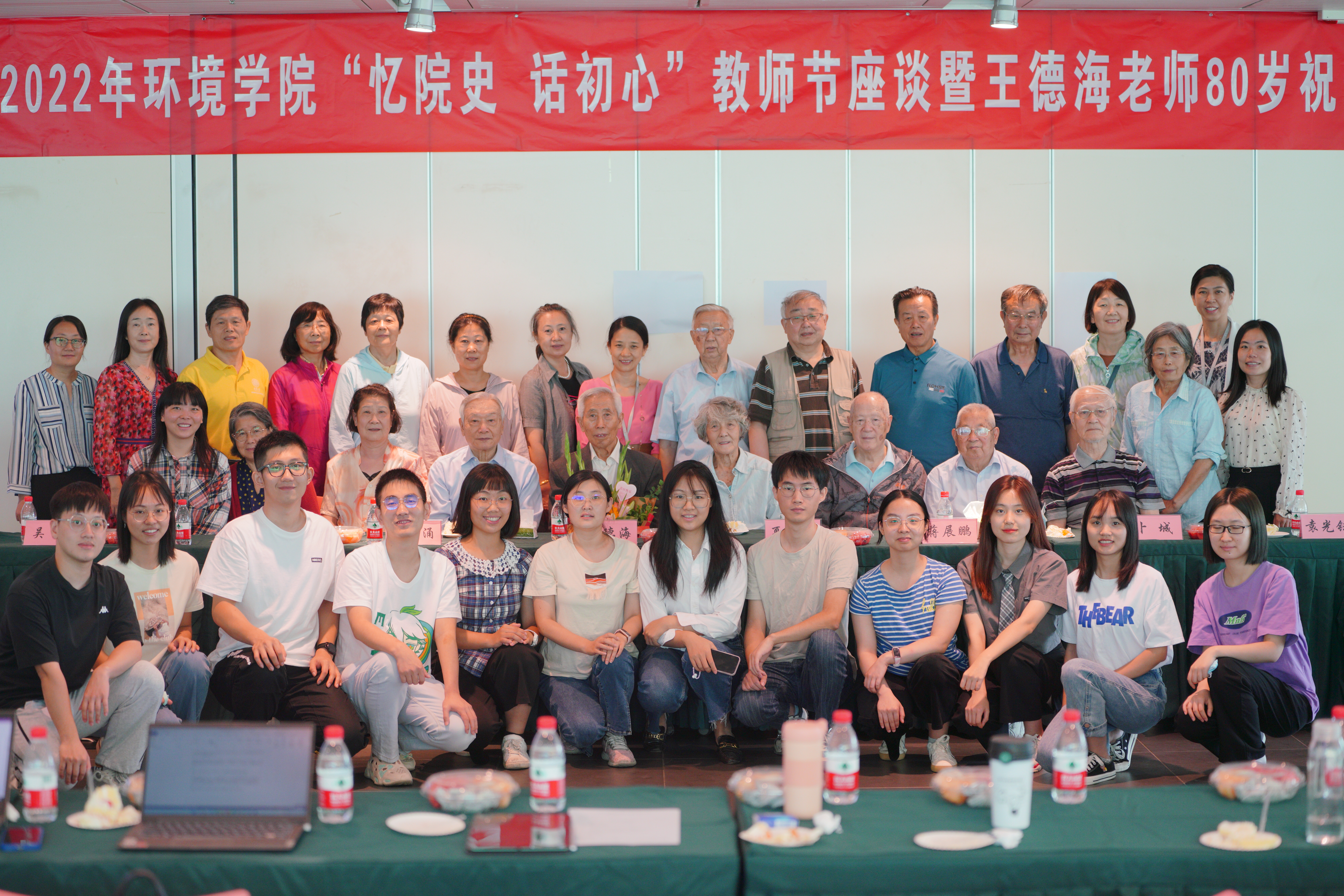 MK官网2022年9月11日电(通讯员 张琦 高澜 魏欣)9月8日上午,在第38个教师节到来之际,环境学院在东一厅举办2022年环境学院“忆院史 话初心”教师节座谈暨王德海老师80岁祝寿会。学院党委书记刘书明、党委副书记吴静,22位离退休教师、环博221新生党支部12名学生和机关支部代表参加了座谈会。吴静主持座谈会。