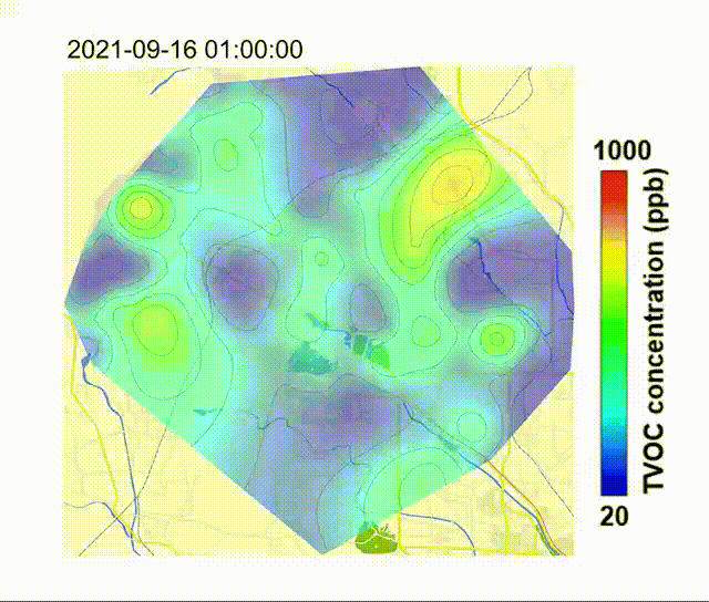 传感器阵列用于大气TVOCs网格化监测。研究组在约55平方千米的混合土地利用区(包含工业区、居民区和城市道路等多种土地利用类型)布设了152台TVOCs监测仪形成网络。监测结果可以及时准确地描述当地TVOCs浓度的时空变化特征,识别VOCs排放来源并指导减排活动。此外,结合车载GC-MS的走航监测结果,能够进一步明确污染来源的类型,与TVOCs监测网络的结果互相印证。