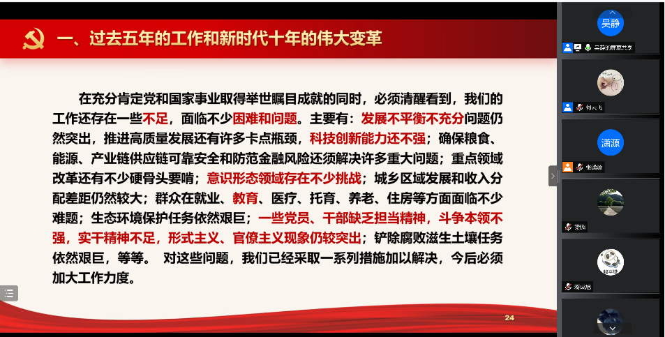 党章是党的根本大法,专题学习的第二个环节是学习本次党章的修改情况。张潇源重点解读了《党的二十大关于党章(修正案)决议》,带领大家逐条学习了大会提出的共识、据此对党章进行的修改,以及写入党章的新内容。做出这些修改完善,充实这些内容,有利于激励全党坚定信心、锐意进取,朝着既定奋斗目标勇毅前行;对激励全党坚定历史自信、增强历史主动,坚守初心使命、传承红色基因,把握新的伟大斗争的历史特点,团结带领全国各族人民夺取中国特色社会主义新胜利,具有十分重大的意义。最后,他还为大家提供了学习材料,并提醒大家一方面要注重学原文,另一方面更要注重理解内涵,努力做到学懂学透。