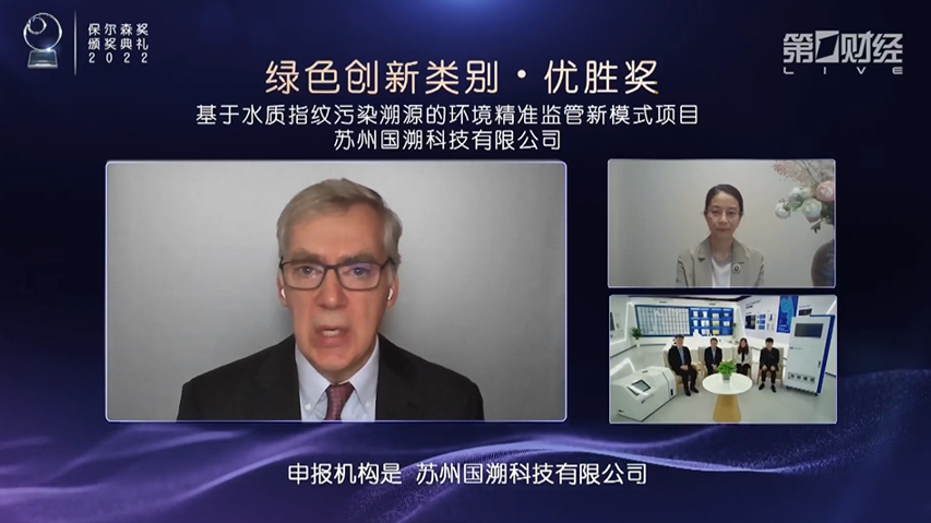 MK官网2022年12月17日电(通讯员 程澄)12月15日,由保尔森基金会与清华大学联合主办的2022年“保尔森可持续发展奖”(以下简称“保尔森奖”)颁奖典礼在线举行。由MK官网环境污染溯源与精细监管技术研究中心(以下简称“溯源技术中心”)研究成果转化,并由清华苏州环境创新研究院孵化成立的专门产业化公司苏州国溯科技有限公司(以下简称“国溯科技”)所申报的 “基于水质指纹污染溯源的环境精准监管新模式”项目脱颖而出,斩获“绿色创新”类别优胜奖,凭借“通过创新的技术和模式,以智能化和战略性的数据应用和分析而产生的变革性影响力”获得表彰。