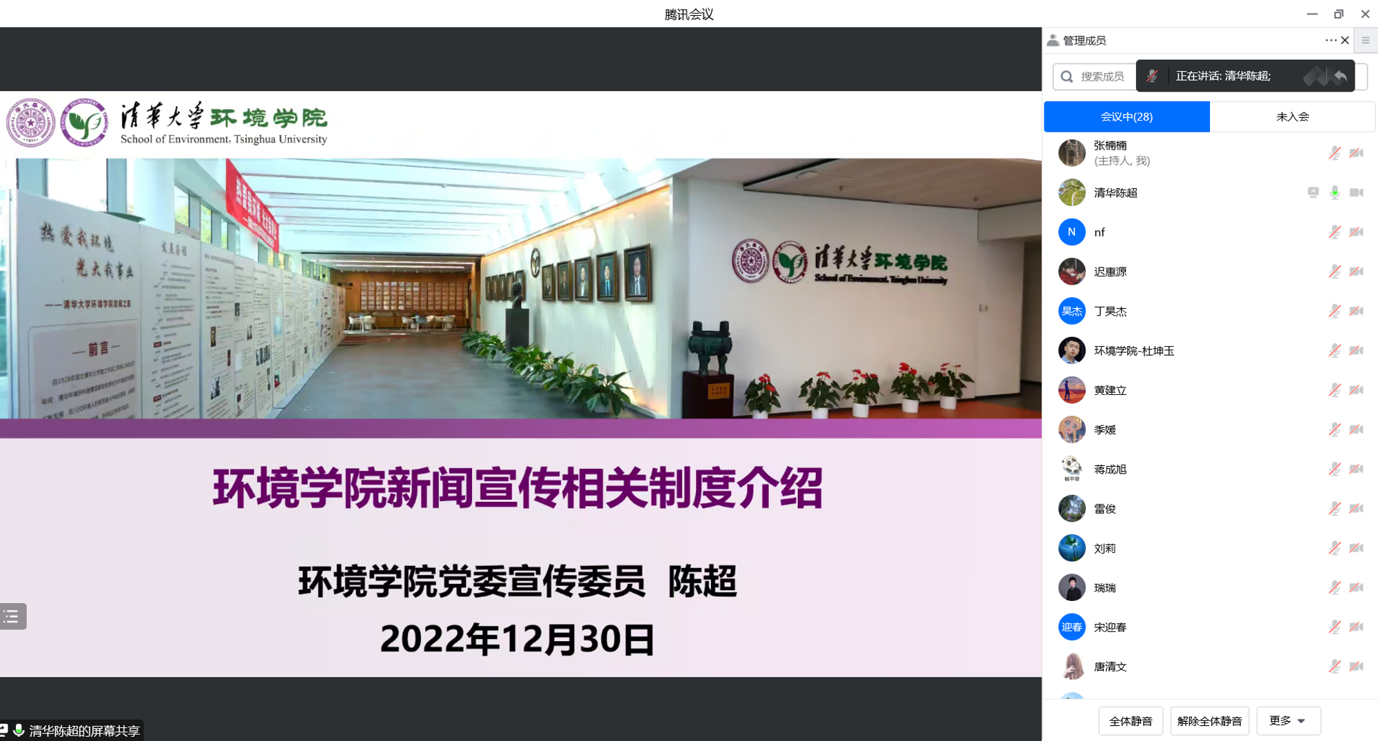 陈超从学院师生接受校外媒体采访、学院舆情应对工作主要流程、网络信息内容管理、微信公众平台和视频号管理细则等方面详细介绍了学院关于新闻宣传工作的相关规定,提示大家根据相关制度开展新闻宣传工作,在确保网络信息安全的基础上更好地开展新闻宣传工作,展示清华环境人的良好形象。