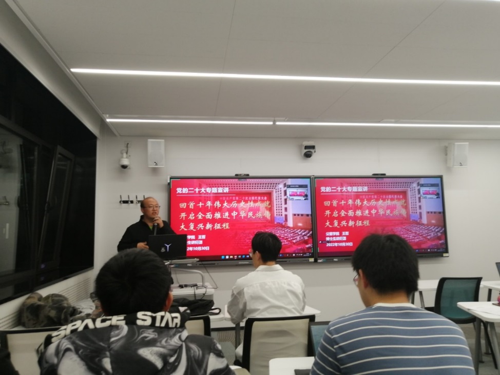 在党的二十大召开之前,为更好地学习党的二十大精神做准备,环9党支部于2022年3月集中学习了党的代表大会制度,并于2022年9月集中学习了党章。党的二十大胜利召开后,为使支部党员全面深入地学习会议精神,环9党支部邀请博士生讲师团讲师王哲进行了专题宣讲,从回顾过去十年、党的二十大报告文本学习、对自主学习党的二十大精神的建议三方面展开,并在宣讲后结合时事热点进行了讨论,使支部同志对当前我国面临的国内国际形势有了更清晰的认识,引发了大家对青年人的使命与担当更深入的思考。环9党支部还特别邀请环境学院院长、环境学院党委委员刘毅老师参加并指导理论学习活动。