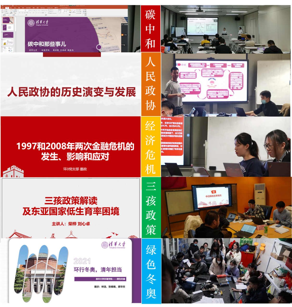 系列“微党课”主题鲜明,内涵丰富:在两会之际,学习人民政协会议制度的历史演变与发展;结合当今国际金融经济形势,回顾世纪之交的经济危机的发生、影响与应对策略;结合专业背景和特点,学习“碳达峰”“碳中和”战略、讨论环境人在冬奥中的担当、了解绿色冬奥的理念内涵以及实际举措;结合时政热点,支部同志共话“三孩政策”,讨论国内外人口结构的发展。