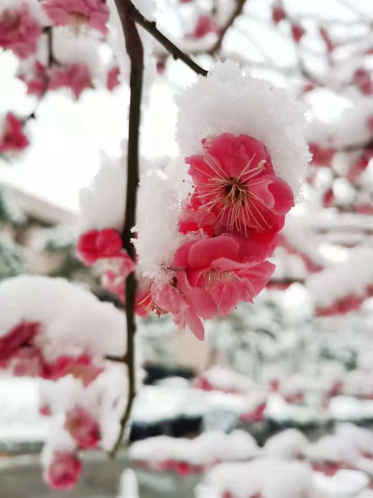 这是2022年校园一角的梅花雪景。以此给学院送上祝福——虎年香瓣瑞雪,兔岁环境日新。