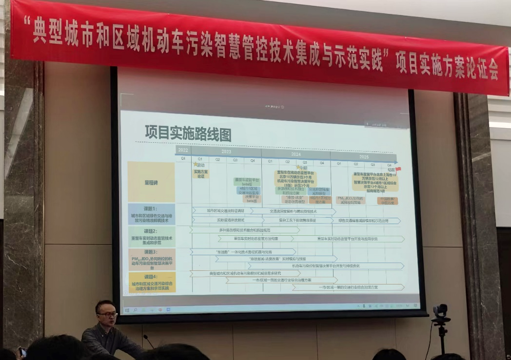 中国工程院院士贺泓主持项目实施方案论证会。论证专家组由中国科学院生态环境研究中心贺泓院士、中国环境科学研究院柴发合研究员、中国环保产业协会易斌研究员、长安大学王元庆教授、北京师范大学田贺忠教授、军事交通学院资新运教授、北京航空航天大学朱天乐教授、成都机动车环保技术有限公司田红教授级高级工程师、深圳市环境科学研究院颜敏研究员组成,贺泓担任组长。