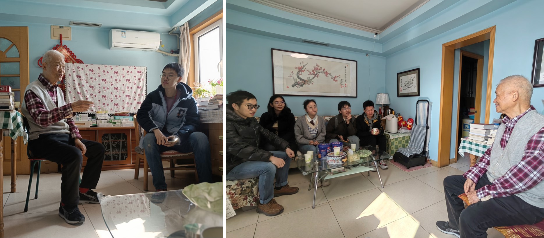 随后,马克思主义学院退休教师宋秦年教授邀请研究生志愿者前往住处参观、交流。他向大家讲述了自己在土木系学习以及在人文学院、马克思主义学院的工作经历。宋秦年老师虽然已经八十多岁了,但始终关心国家发展并坚持用文字表达出自己的观点与想法,也一直在社区向大家讲授党课,始终在其研究领域发光放热。他还向志愿者展示了自己的书法作品,介绍了他丰富多彩的退休生活。志愿者们也向宋秦年老师提出了一些关于自然科学与社会科学等方面的疑问,宋老师结合自己在自然科学与社会科学两方面的学习和工作经历,向志愿者们详细讲述了自然科学与社会科学的互通性问题,耐心、细致地解答了同学们的问题。