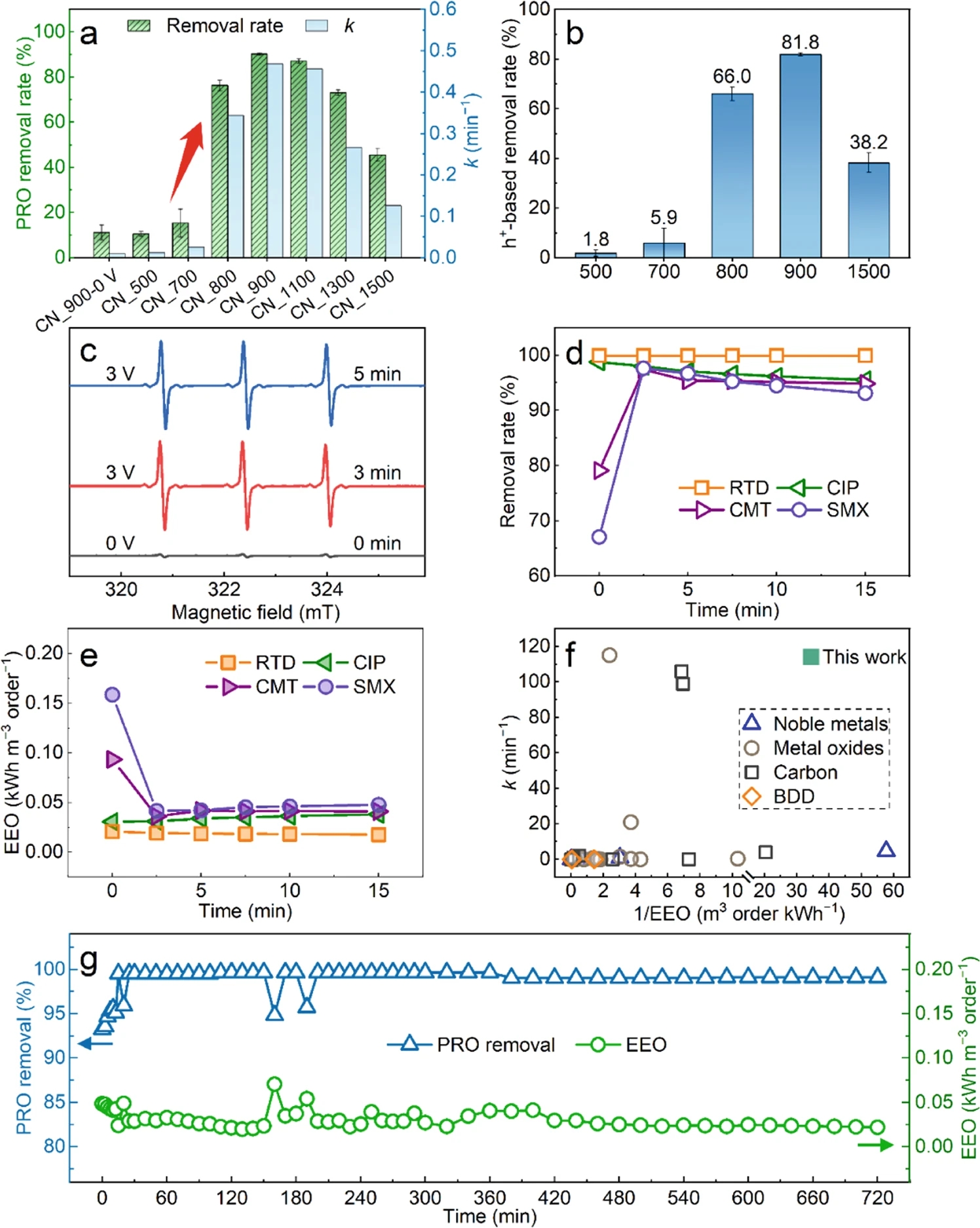 受益于这种调控策略,基于常规材料和常规热法后处理技术制备的碳基电纺膜获得了高效、低耗和稳定的电催化降解性能(图3)。直接氧化在电催化降解普萘洛尔(PRO)过程起主要作用。在单次过滤(停留时间约2.5s)、高通量(424.5L·m−2·h−1)、连续测试(720min)条件下,成功实现了>99%的稳定降解率以及非常低的能耗(EEO仅为0.029 kWh·m−3·order−1)。这种热调控策略将有希望为未来精确、可控地制造各类催化剂提供科学基础。