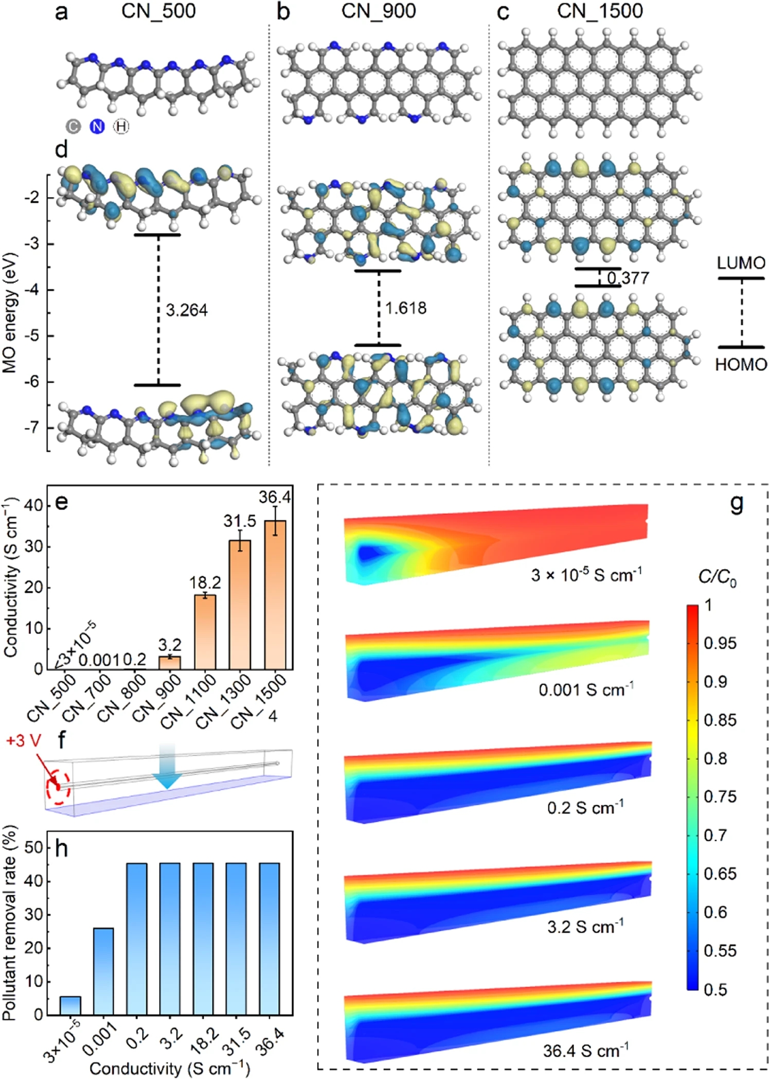 研究团队基于表征、计算和模拟,阐明了热处理对碳基电纺膜微观原子/晶格结构的影响机制。研究发现,改变碳化温度能够通过“碳环化-氮挥发-石墨化”机制在碳纳米纤维膜制备过程中对氮元素和碳基结构进行精细调控。基于密度泛函理论的量子化学计算表明,适当的热处理可以提高氧化还原活性,增加电子转移能力,提高吸附能力,从而显著提高电催化效率。进一步的多物理场耦合计算强调了增加电催化活性位点对于提高电催化性能的重要性(图2)。