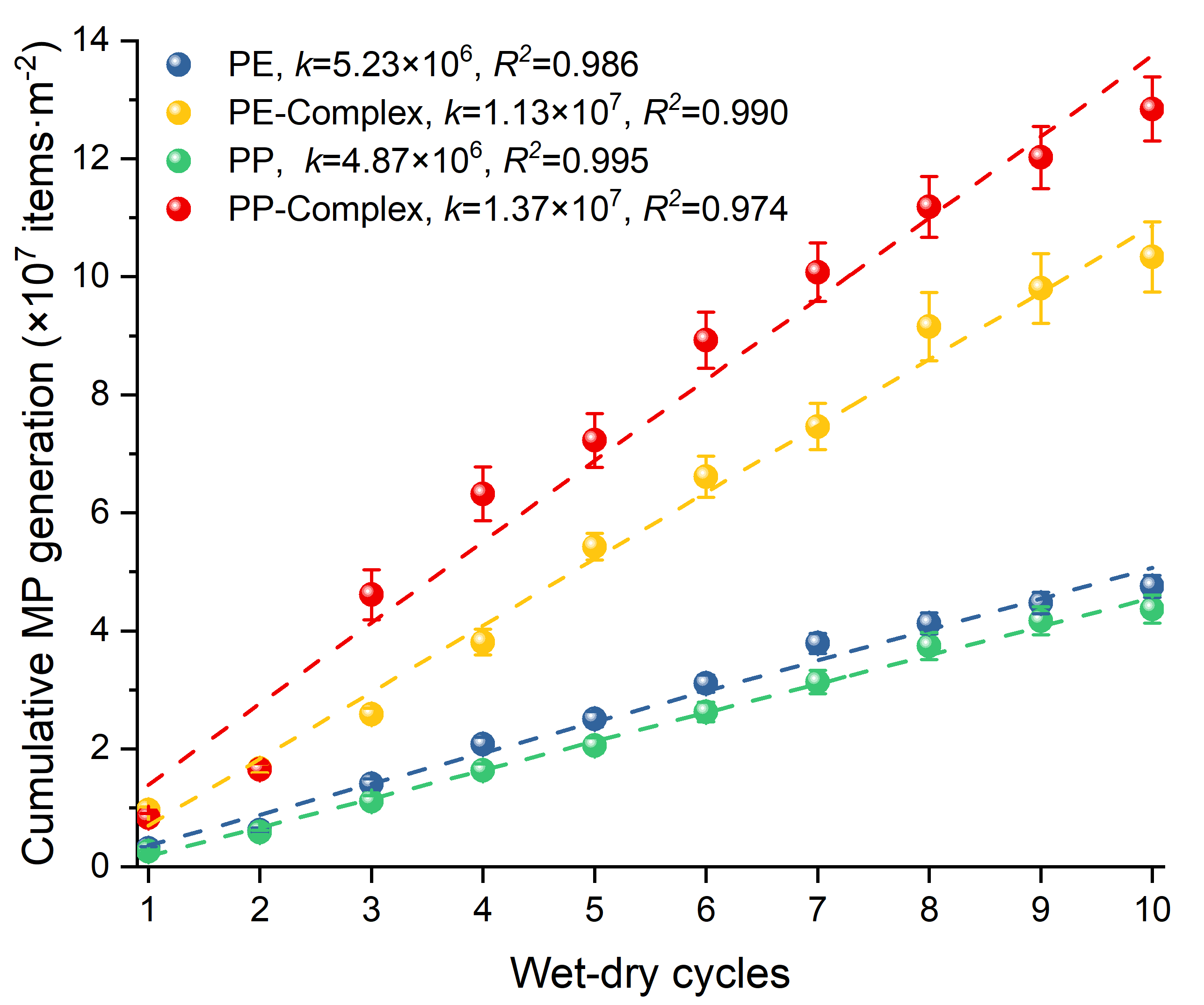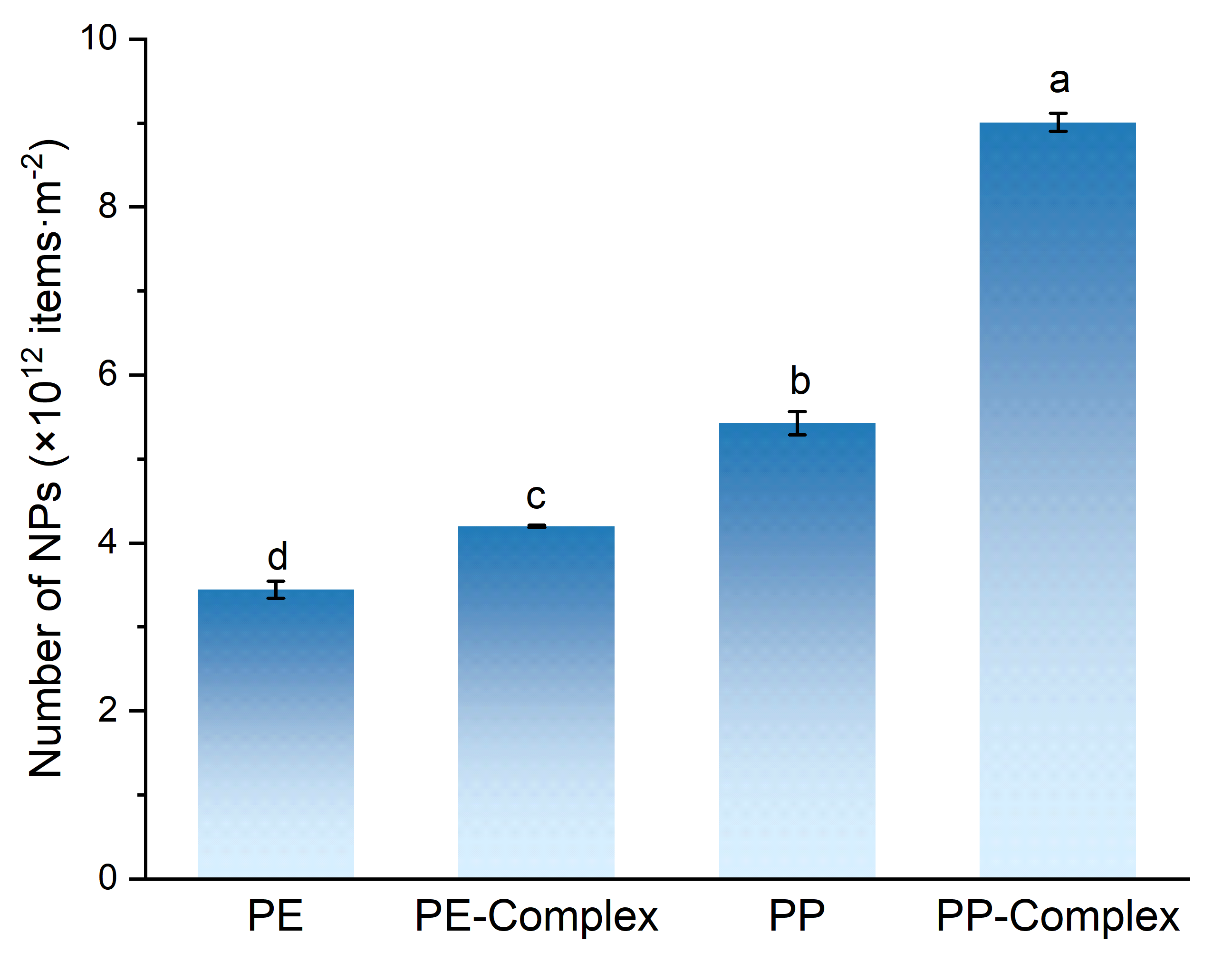 研究团队在实验室内通过干湿循环实验,探究了塑岩释放微纳米塑料的能力。与利用吹膜法制备的相同厚度塑料薄膜相比,相同循环次数下塑岩中的LDPE和PP可释放更多微塑料颗粒。微塑料的释放过程遵从零级动力学,显示出持续的微塑料释放能力。10次干湿循环过程中,LDPE与PP分别可累积释放1.03×108个/m2、1.28×108个/m2微塑料颗粒(图4),其释放速率比文献报告的垃圾填埋场、海洋环境下微塑料的释放速率高2个数量级以上(图5)。除此之外,干湿循环同样造成了纳米塑料的释放。NTA表征结果显示,单次干湿循环即可从塑岩结合的LDPE与PP中释放4.20×1012个/m2,9.01×1012个/m2纳米塑料颗粒(图6)。在全球变化的大背景下,洪水泛滥事件造成的干湿循环频次增加,这一塑料的赋存形式与其它赋存形式相比,存在较高的生态风险。这一发现是塑料这一人造材料进入自然界地质循环过程的直接证据,阐释了塑料制品在环境中一种新的风险机制与归趋。