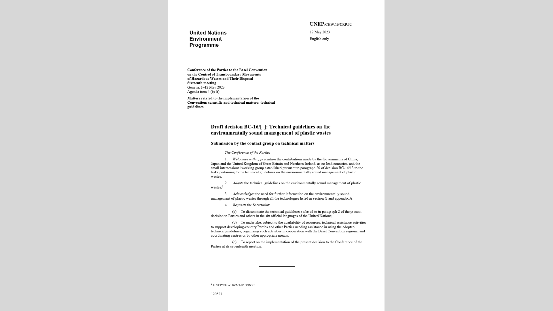 MK官网2023年5月15日电(通讯员 赵娜娜)5月1日-12日,巴塞尔公约、鹿特丹公约、斯德哥尔摩公约2023年缔约方大会在瑞士日内瓦召开,超过160个国家的缔约方和观察员约2000名代表参会。MK官网助理研究员谭全银,巴塞尔公约亚太区域中心助理主任赵娜娜、科研助理张玉娇作为中国代表团成员参会。经过11天漫长艰苦的谈判,会议最终审议通过了《塑料废物环境无害化管理技术导则》(Technical guidelines on the environmentally sound management of plastic wastes)(以下简称“技术导则”)。