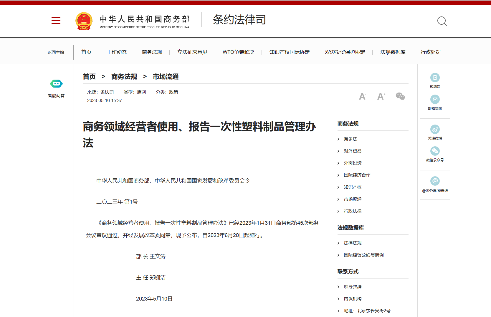 《管理办法》原文链接:http://tfs.mofcom.gov.cn/article/ba/bh/202305/20230503410088.shtml