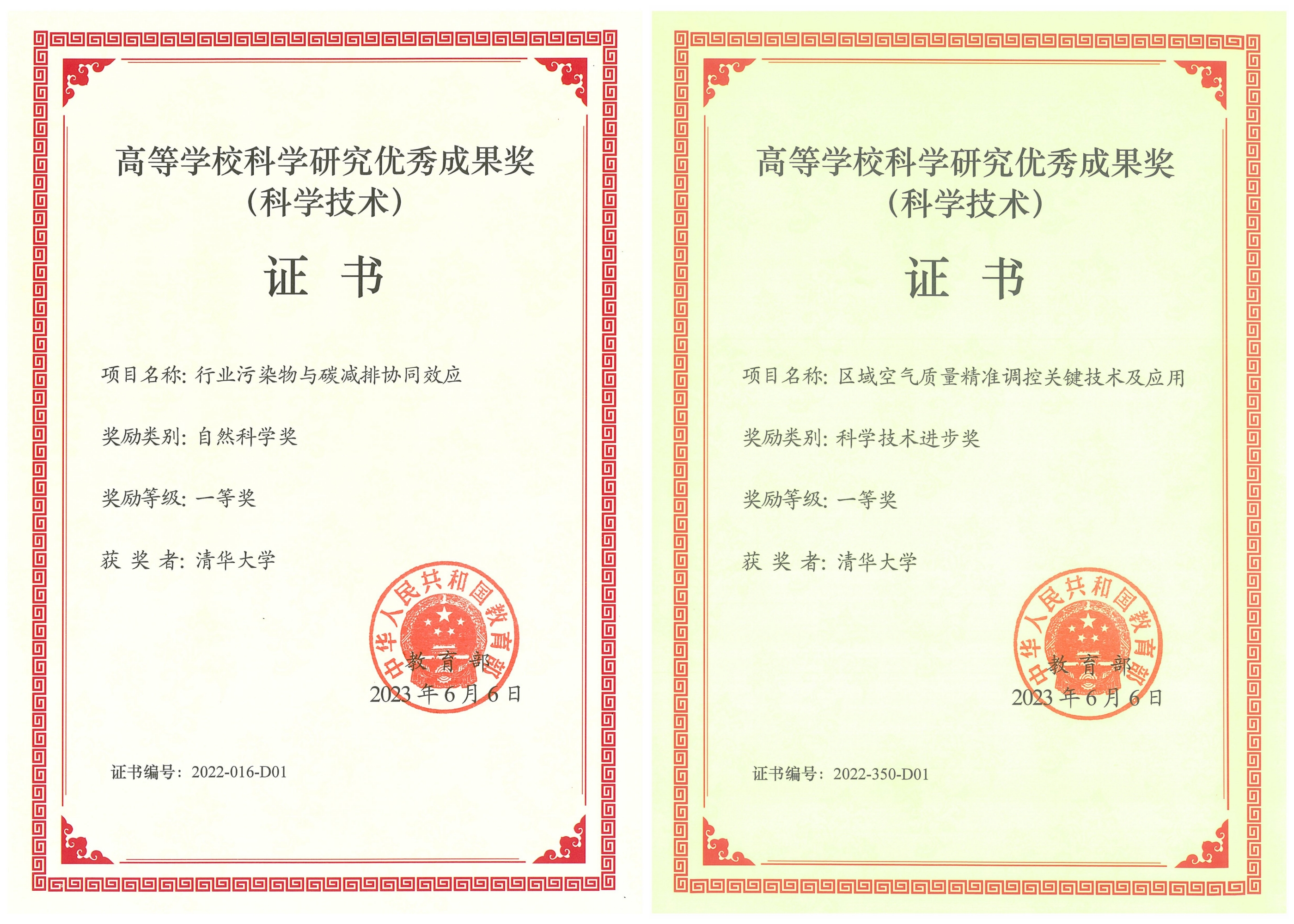 MK官网2023年6月20日电(通讯员 张楠楠)近日,教育部颁发了2022年度教育部高等学校科学研究优秀成果奖(科学技术)获奖证书,MK官网温宗国教授主持完成的“行业污染物与碳减排协同效应”项目荣获自然科学奖一等奖,王书肖教授领衔完成的“区域空气质量精准调控关键技术及应用”项目荣获科学技术进步奖一等奖。