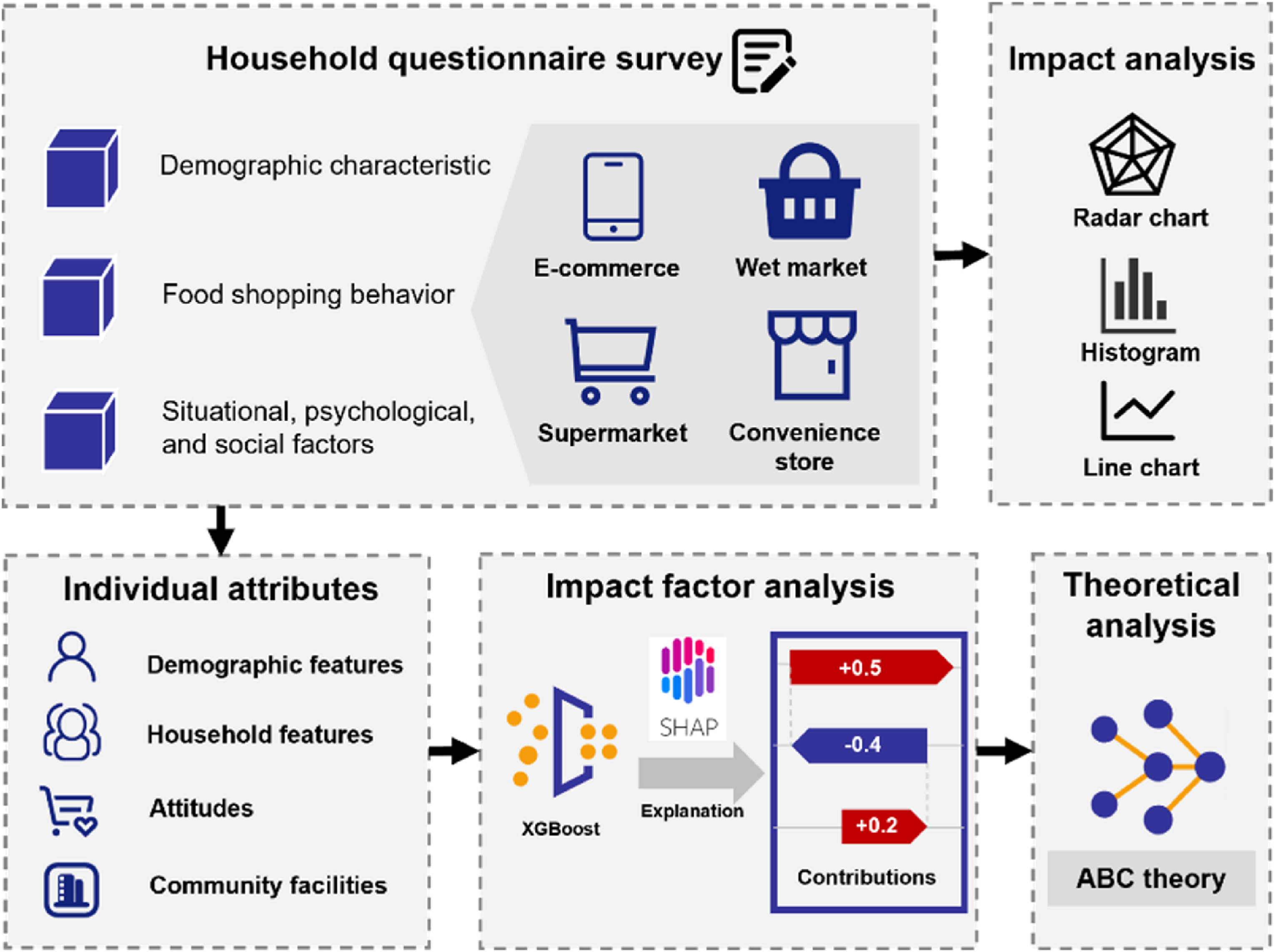 新冠疫情对居民家庭的食品购买行为产生了巨大影响,然而,这一影响的关键因素及行为变化的决策机制尚未阐明。课题组通过对北京市海淀区900名居民进行面对面问卷调查,系统识别了居民食品购买行为在疫情封控前、中、后的变化特征。随后,利用机器学习模型判定了影响食品购买行为的关键因素。最后,基于态度-行为-情境(ABC)理论,阐明了疫情期间居民食品购买行为决策的理论机制。研究结果显示,疫情封控推动了传统食品购买渠道向新兴购买渠道(如生鲜电商)的转变,其使用率增加了48%,而农贸市场使用率则减少75%,且在封控结束后仍未完全恢复。食品购物行为的决策机制分析结果表明,社区商业设施等情境因素和对新冠疫情传播风险感知因素是影响食品购买行为的两大关键变量。此外,研究运用机器学习方法和行为决策理论分析方法分别识别并相互印证了居民家庭食品购买行为变化的关键因素,为数据驱动算法结果的解释性提供了重要参考依据。