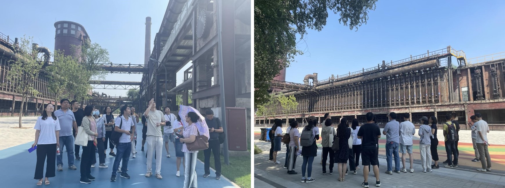 首钢集团技术人员首先介绍了炼铁厂三高炉,高炉将铁矿石在还原氛围下冶炼出生铁。秀池原用于存放炼铁循环用水,现已改造为景观水池,地下部分为圆形下沉式展厅和地下车库。园区内的四座冷却塔停产前是原“首钢电厂”配套设施,用于热水和空气之间的热交换,为电厂发电提供冷却水,改造时保留了工业空间并加入了艺术穹顶等元素。四高炉大修工程上料系统N4-2转运站的料仓现已改造成办公区,保留了上部原始钢框架和中间斗仓,增加了办公空间和屋顶花园。工业遗存与现代工业技术融合,推进产业复兴。