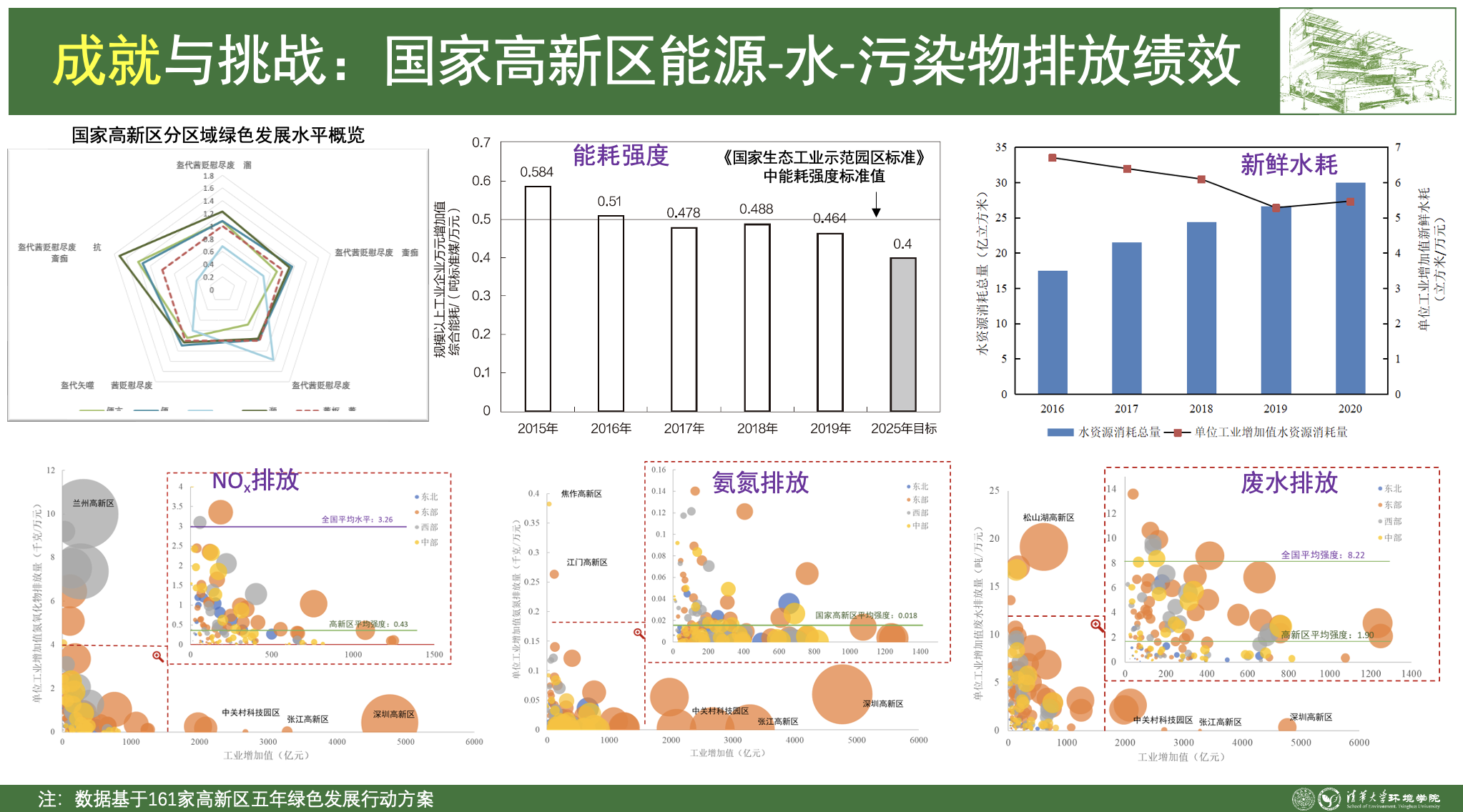 以161个国家高新区为样本,分析三大类10余项关键指标,建立绿色发展指标体系和指数方法,综合评估2016年到2020年国家高新区的绿色发展绩效,绿色发展指数从76.97增长到87.22,增长了13.3%。能耗强度方面,从0.584吨标煤/万元工业增加值下降到0.464吨标煤/万元工业增加值,降幅超过20%。水资源消耗方面,国家高新区新鲜水耗从6.70下降到5.46立方米/万元工业增加值,累计下降了14.6%。污染物排放方面,国家高新区工业废水排放强度均值为1.90吨/万元,不到全国平均水平的1/4。氮氧化物排放强度为0.43千克/万元,远低于3.26千克/万元的全国平均水平。
